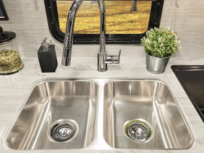 - The beauty of the galley is in the details, like durable Corian® solid surface countertops, recessed 3-burner range with glass-covered oven (NA 22R), stainless steel sink, double-door refrigerator and expansive pantry (22M, 31H, 31K), all designed to make you feel right at home.