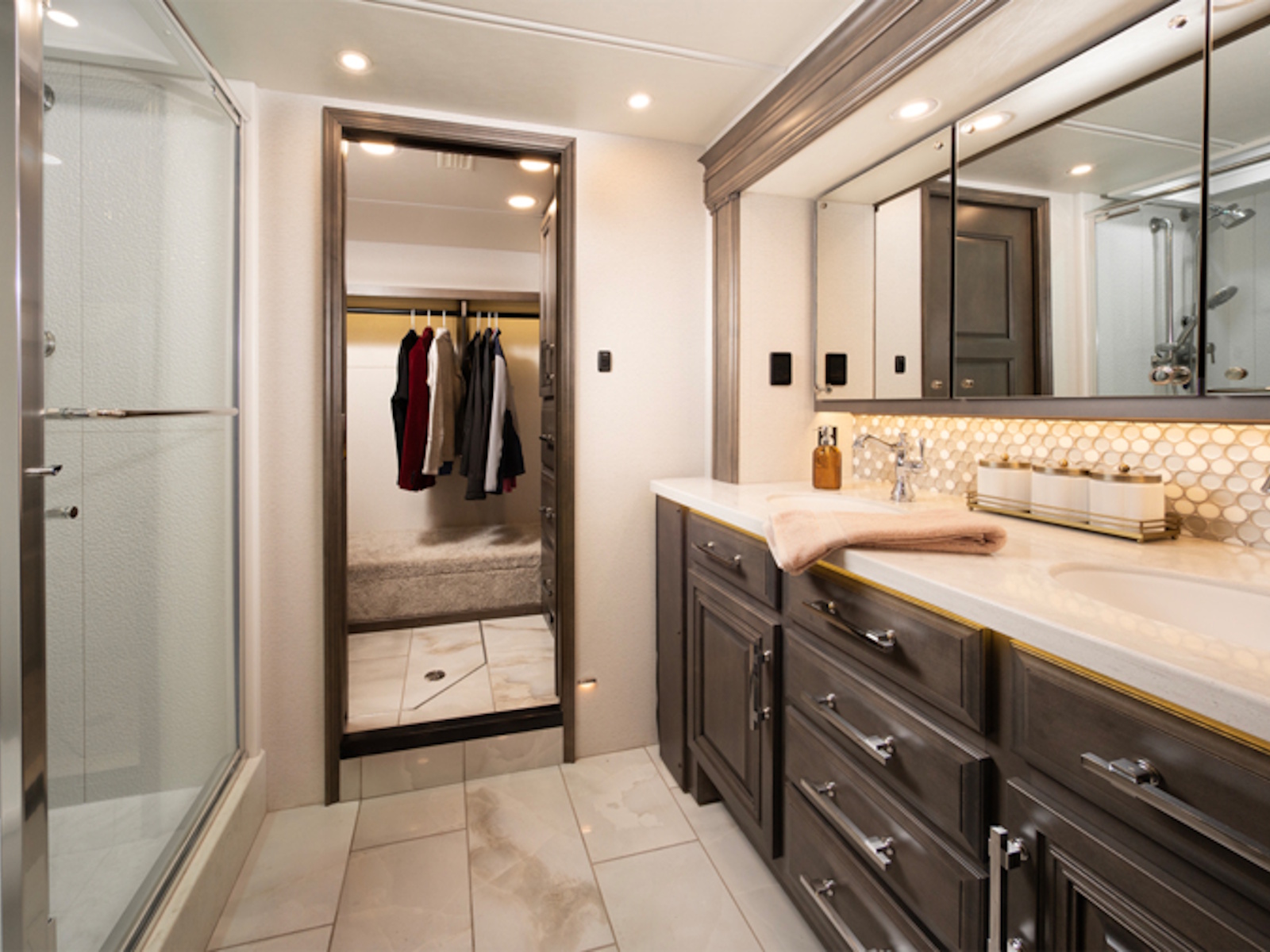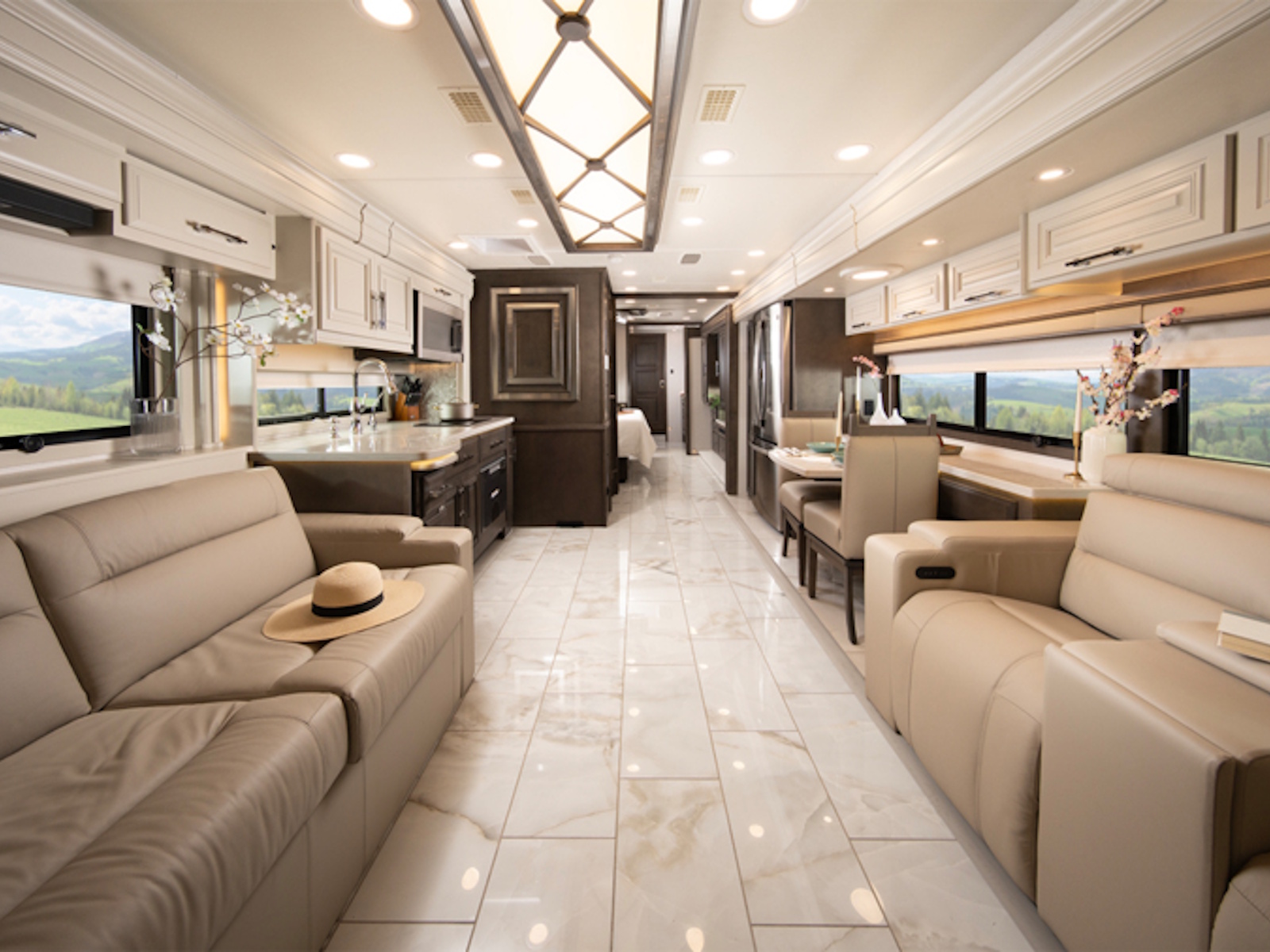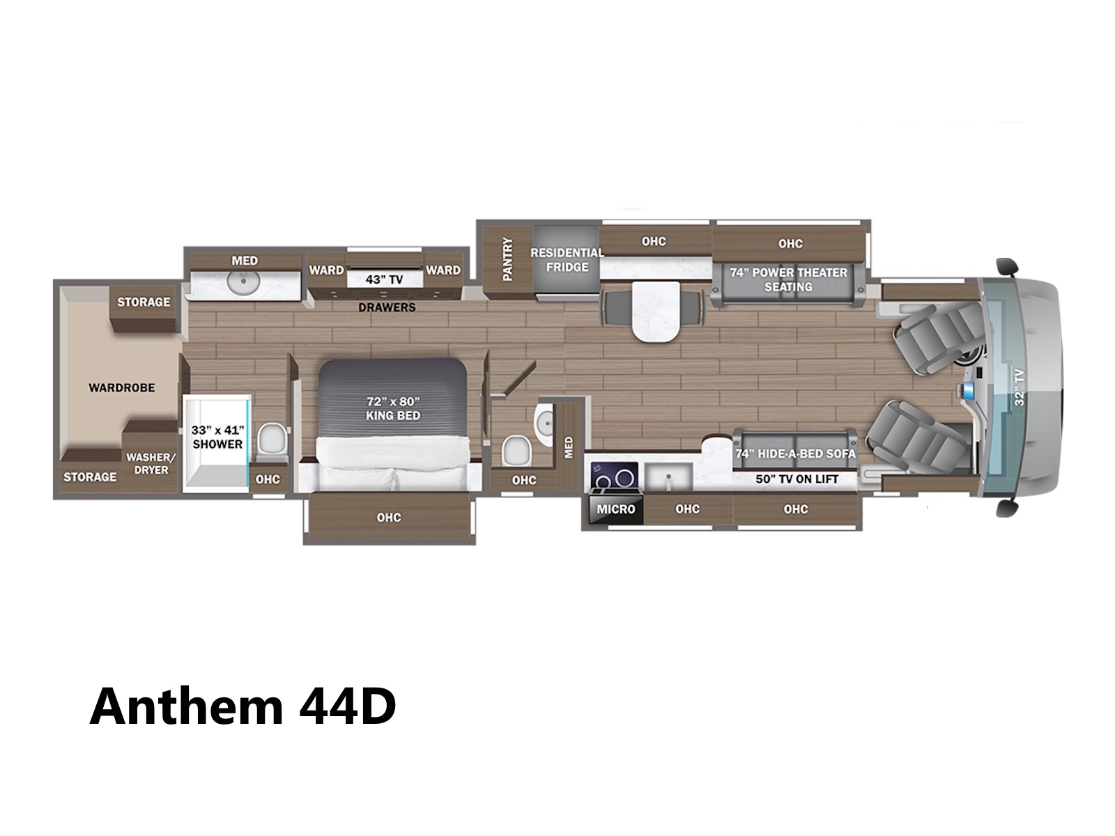 The Anthem has six different layouts available so you can find the perfect floorplan for your needs. If you have been searching for a coach with the bells and whistles of a high-end diesel pusher but in a shorter length, the under-forty-foot 37K will be your answer. Once you decide which floorplan is right for you, choose from four wood colors, three décor packages, three tile colors and six paint packages to ensure your coach is exactly as you have envisioned. Regardless of floorplan, the Anthem features rich fabrics, genuine Italian leather furniture, custom-built hardwood cabinetry, hand-tiled porcelain floors, residential kitchen appliances and top-of-the-line electronics to make you feel right at home on the road, or maybe even better.
