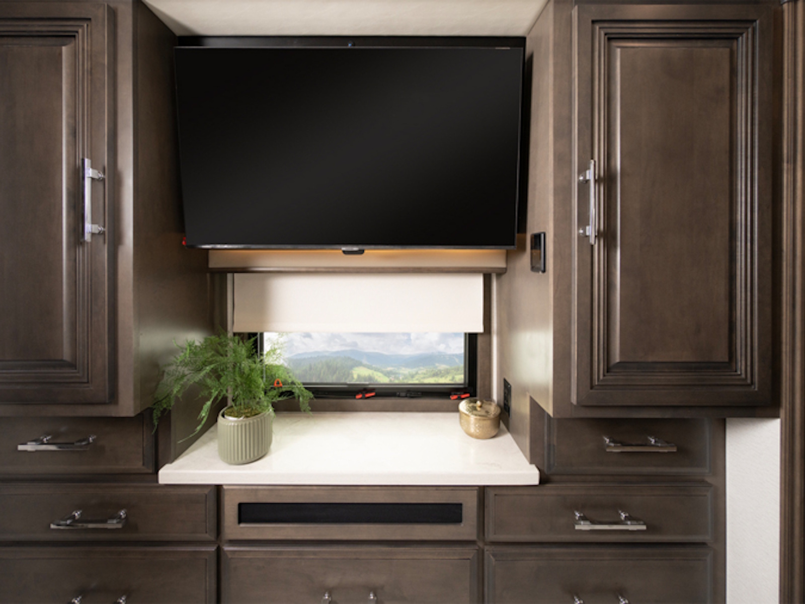 Adding multiple powered components brings ease to the Anthem that you won’t find in the coaches below it. First, double your battery power with four standard L16 AGM batteries. Next, you will have easy access to all of the equipment you’ve packed in your basement with the touch of a button, thanks to not one but two powered cargo trays. The exterior conveniences continue with power window awnings and a power generator tray. Inside, your upgraded Firefly Nebula total coach control system makes operating your power day/night roller shades easy.