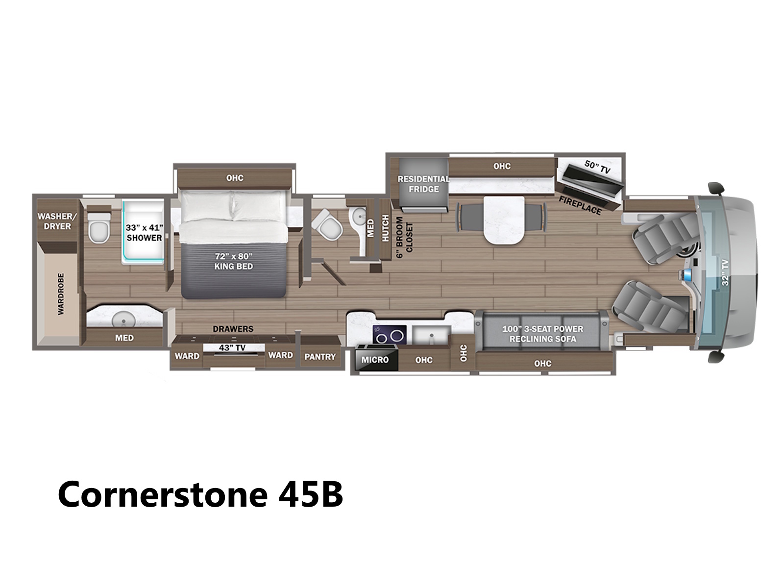 The Cornerstone's living space offers options in wood, décor, and tile color so you can build the coach of your dreams, regardless of your taste. Luxurious Italian leather furniture throughout, hand-tiled floors, backsplashes and showers, premium residential appliances, and custom-built hardwood cabinetry give the Cornerstone interior an unmatched look and feel.