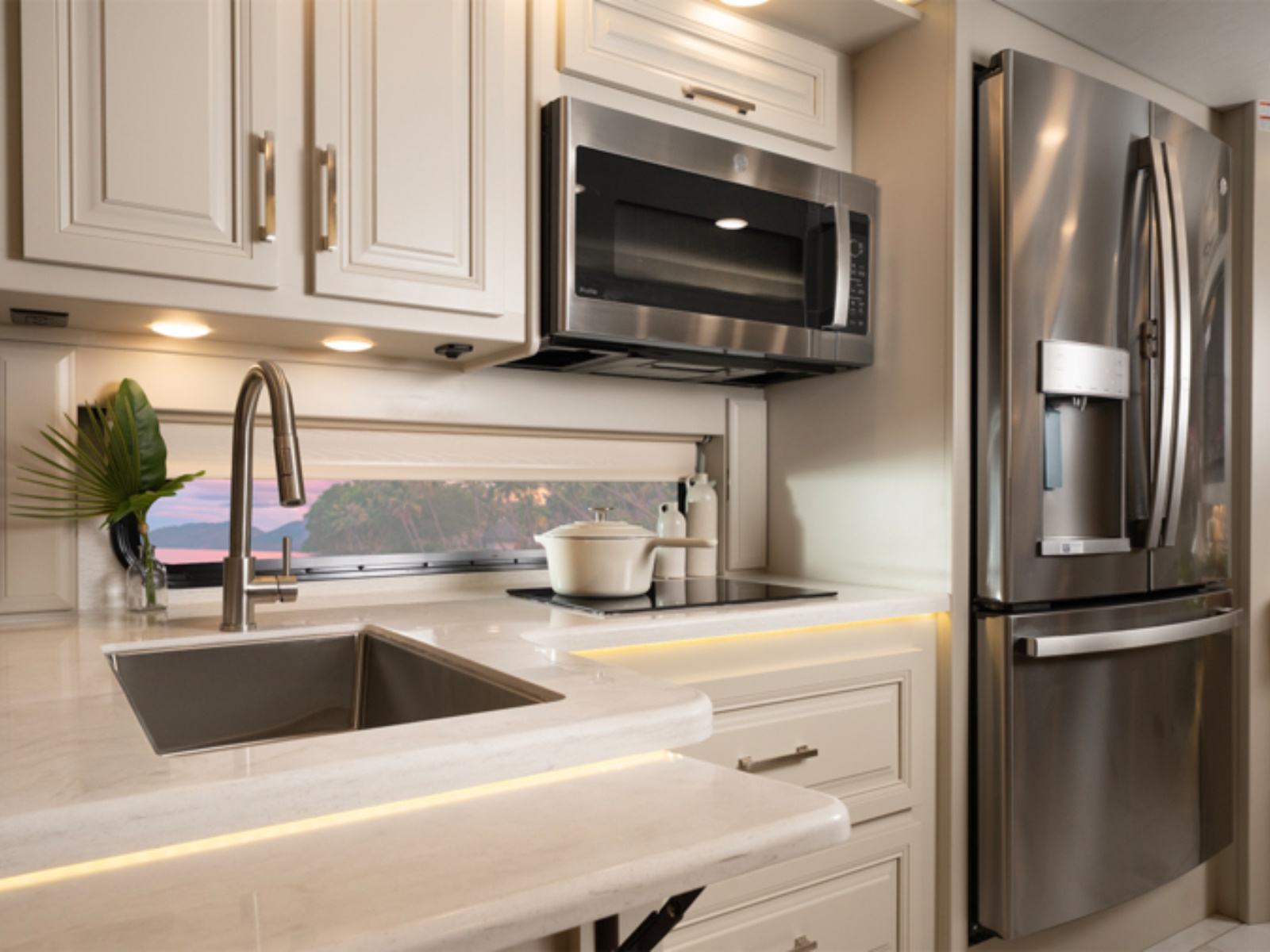 - Customer Value Package (Mandatory) E-Z Drive Premier; dual-pane, tinted, safety-glass windows; roof-mounted Girard patio awning with LED lights; 2KW pure sine wave inverter; power cord reel with 50 amp service; Aqua-Hot® 250D hydronic water and heating system; 9 in. Sony® infotainment center with Apple CarPlay® and Android Auto™; backup and side-view cameras, stainless steel residential refrigerator; 1.7 cu. ft. convection microwave with air fryer function