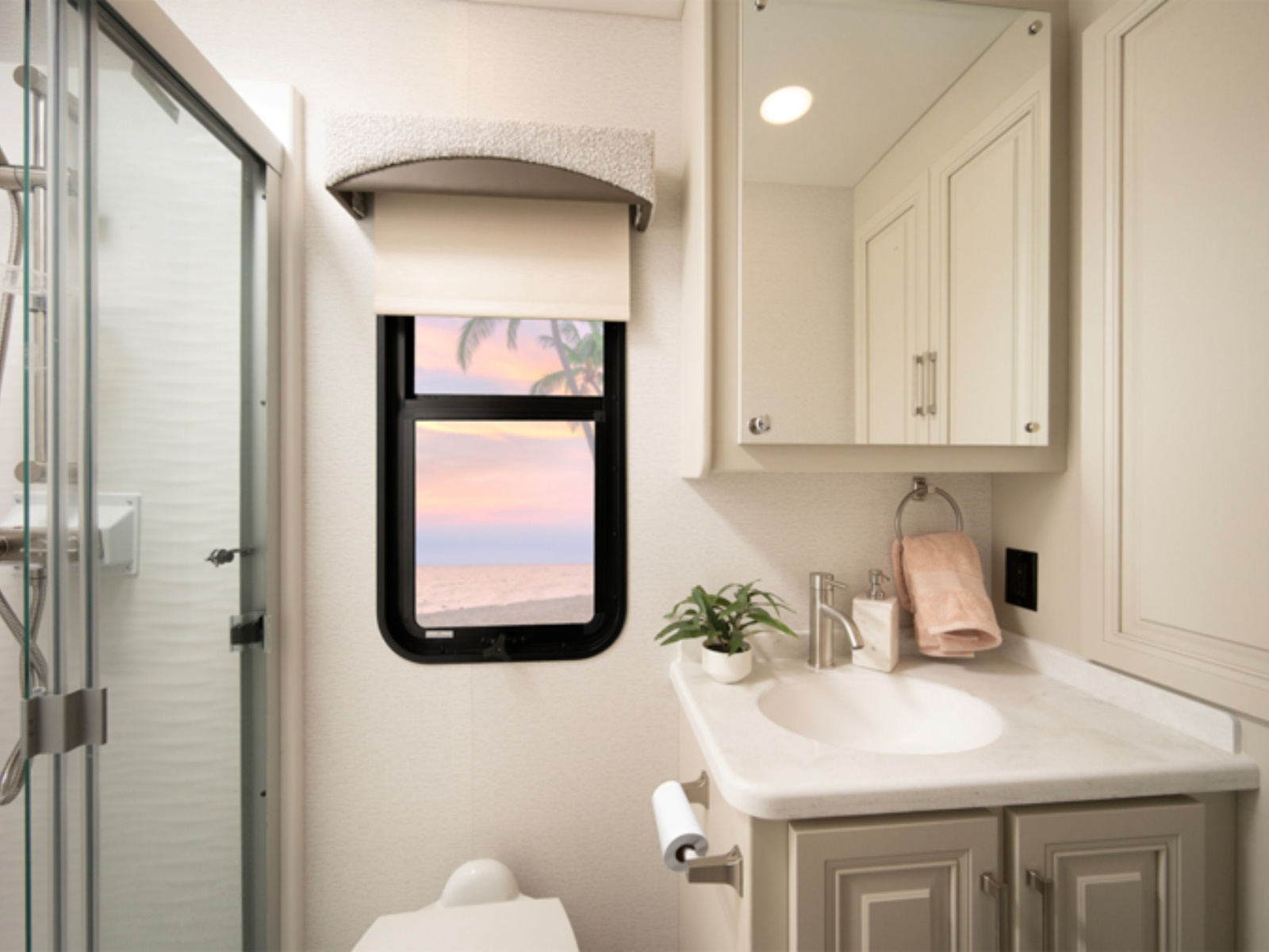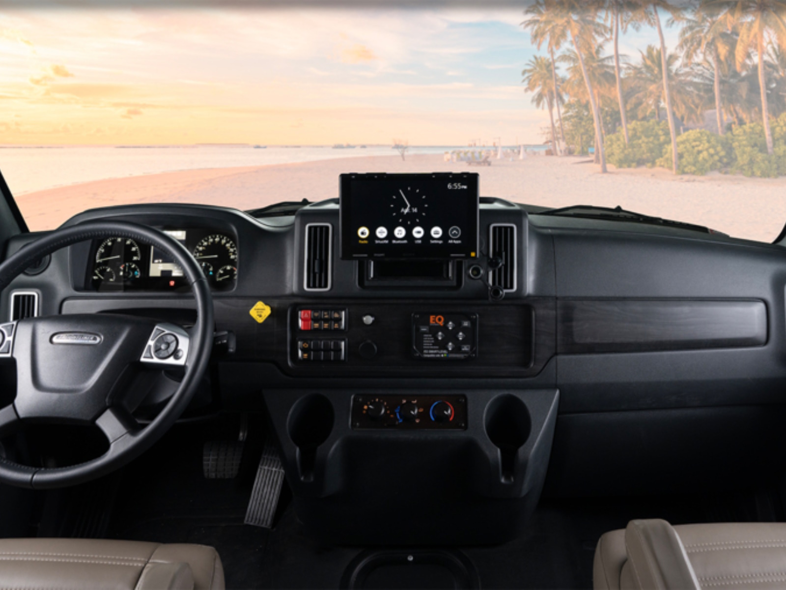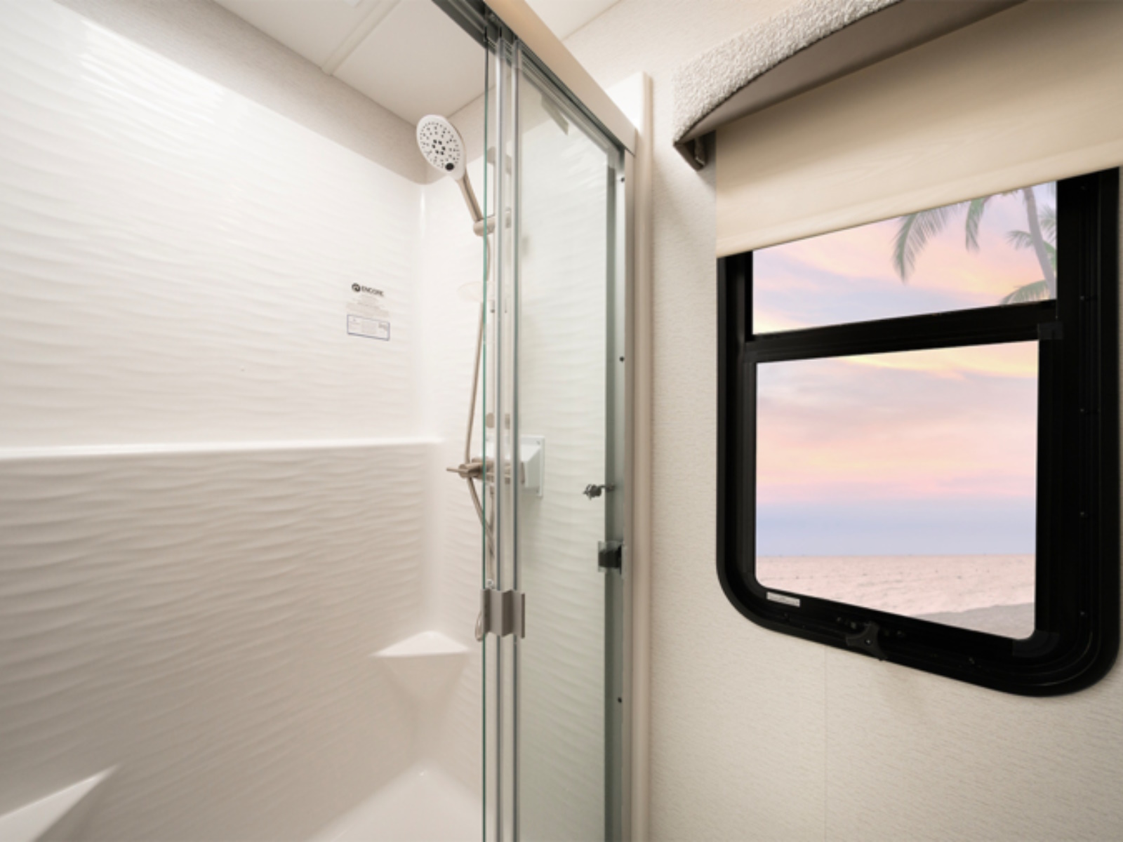 - Front/Rear Cap One-piece, seamless, fiberglass front and rear caps with automotive-bonded panoramic window in front cap with power shade