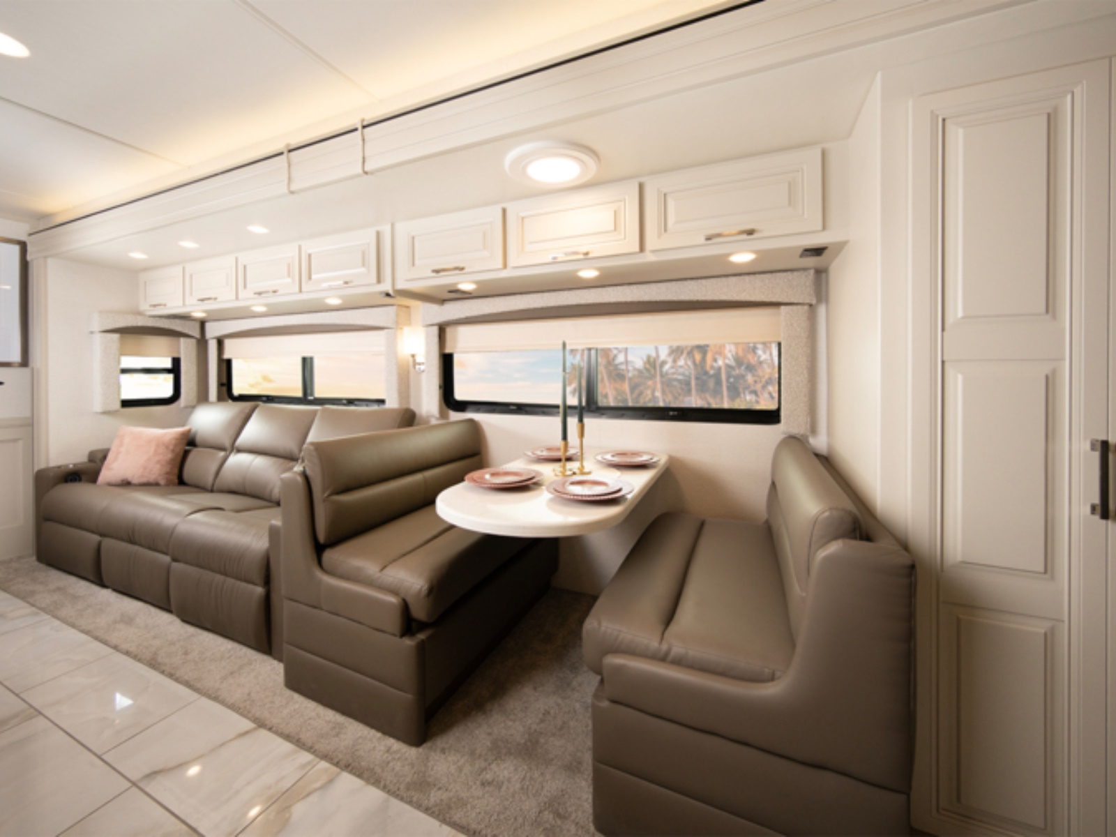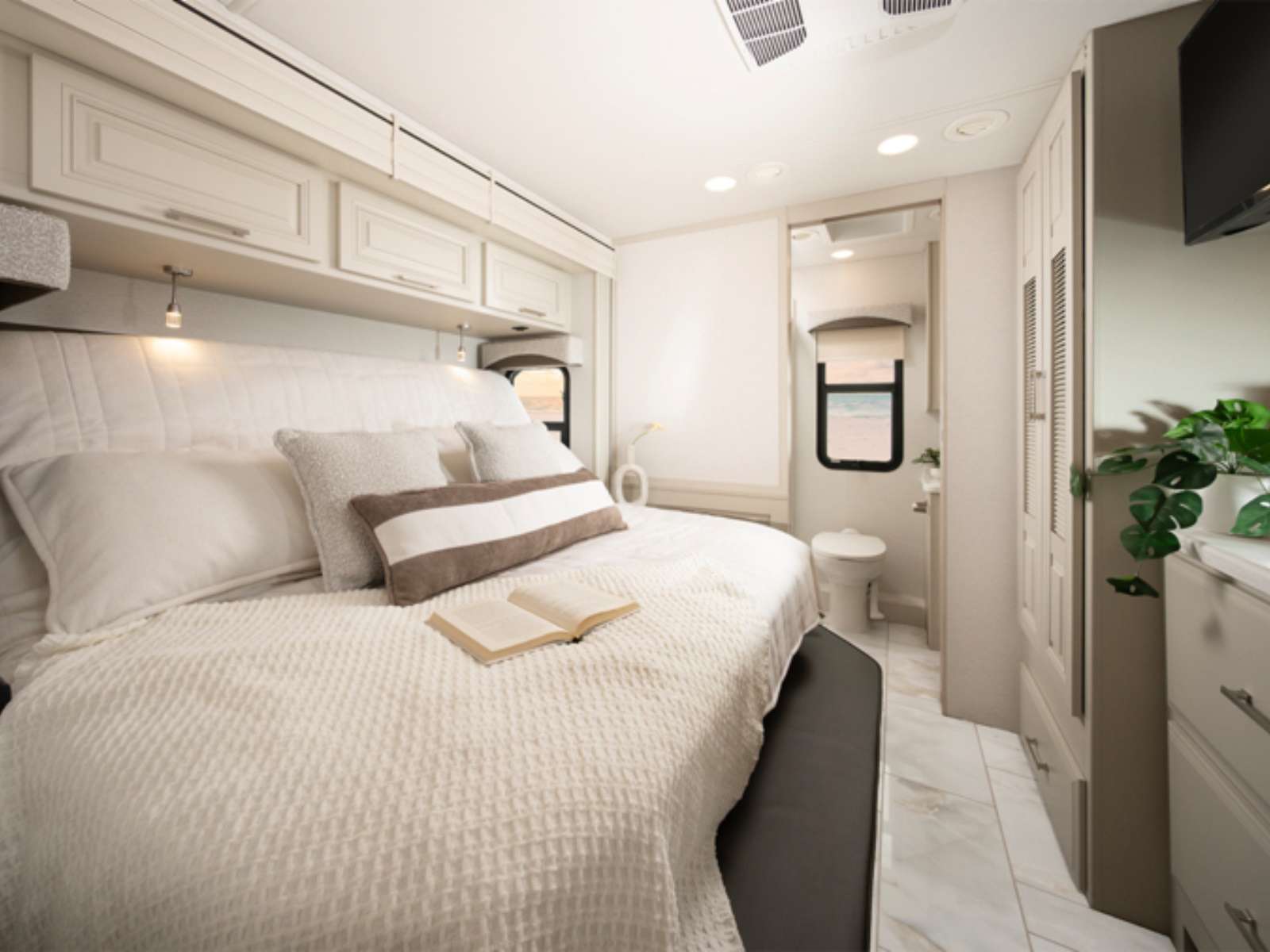Inside, craftsmanship defines the experience. Hand-laid porcelain tile, solid hardwood cabinetry and stiles and premium fabrics create a sophisticated atmosphere, while the Aqua-Hot® heating system with electric floor heat keeps every corner cozy. With the Firefly total coach control system and app-based integration, managing lighting, climate, and more is as intuitive as it is effortless.