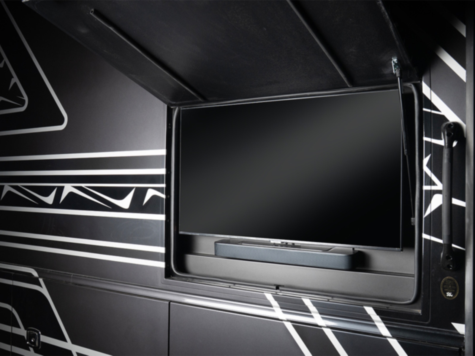 - Entertainment Exterior entertainment center with soundbar, LED TV mounted on swivel bracket and AM/FM radio