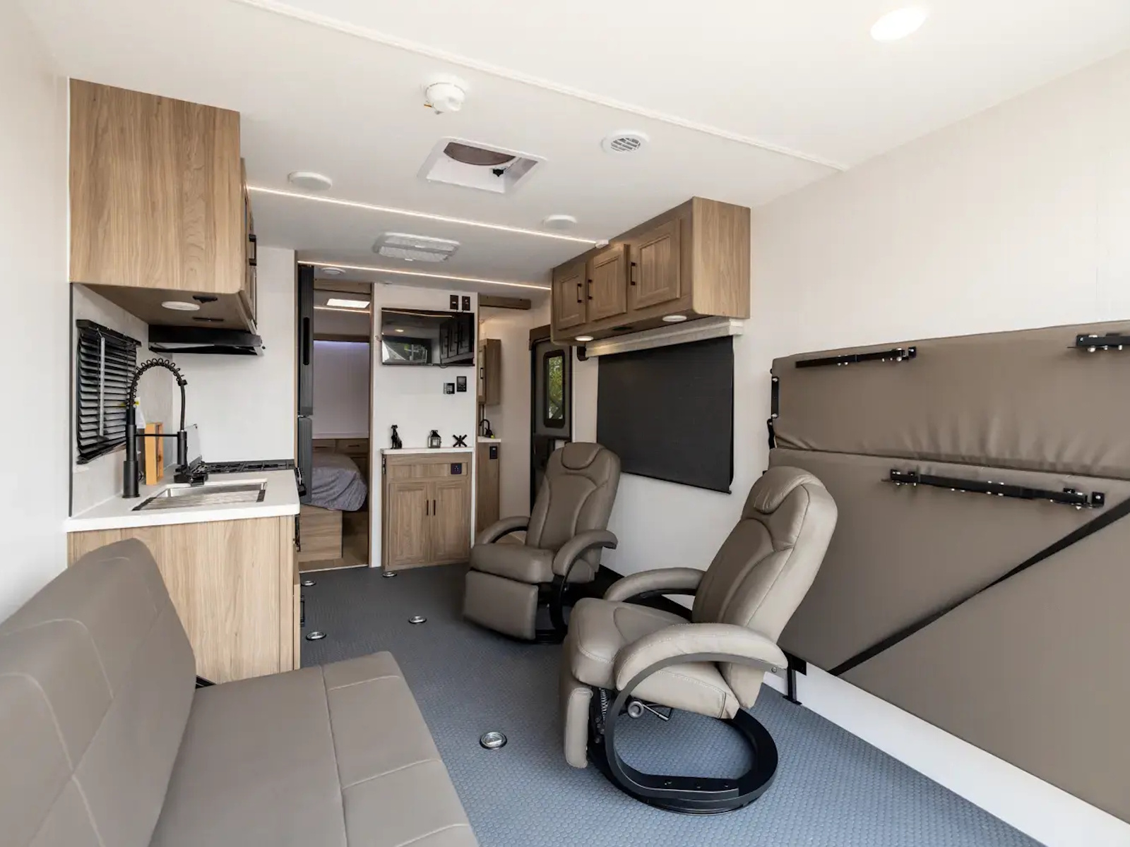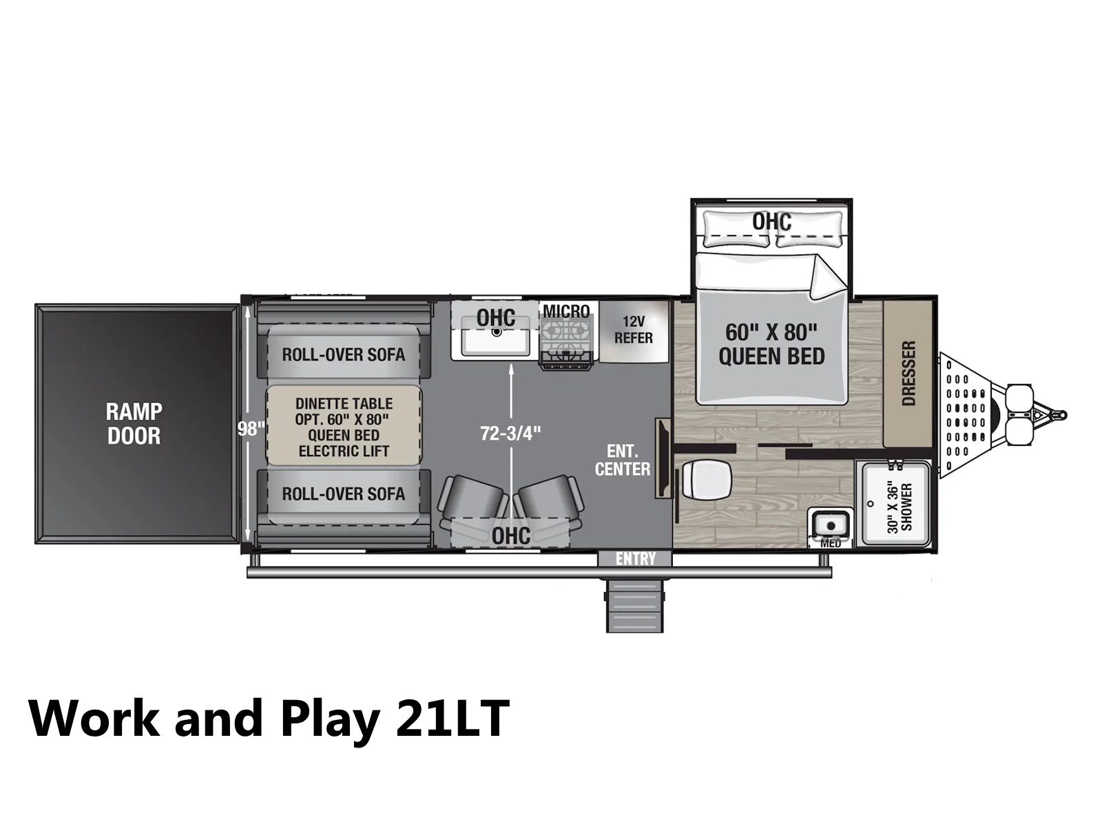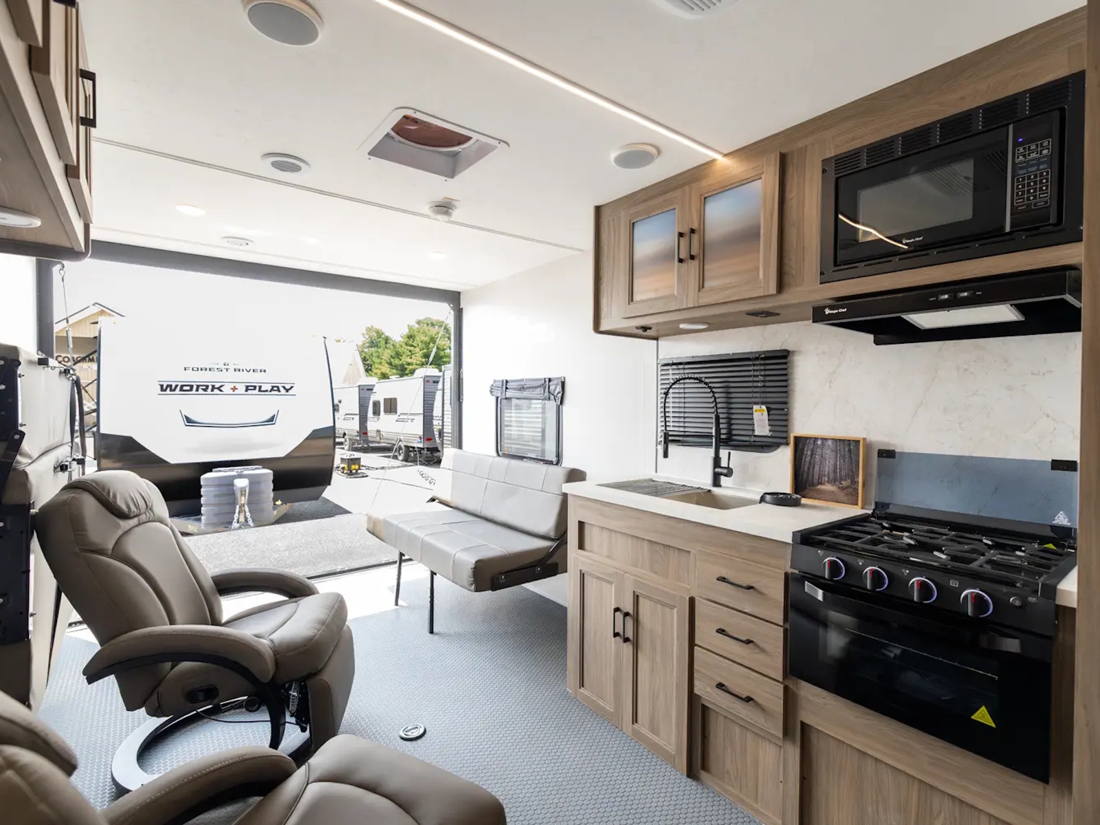 At 27' 5", the Work & Play 21LT expands garage room while still staying tow-friendly for outdoor enthusiasts. The large cargo bay handles your gear, and the interior supports both gear storage and comfortable breaks. Ideal for off-road adventures or family trailside escapes.