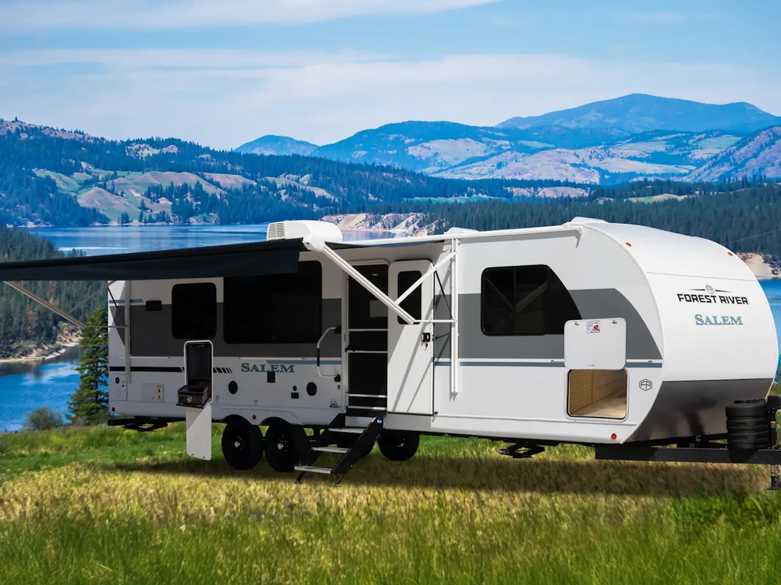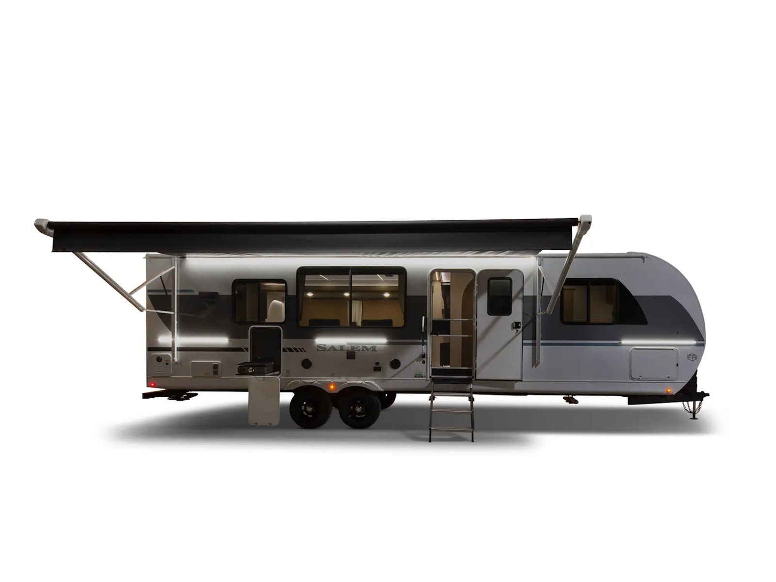 The Salem 27RE gives you a spacious living room area thanks to two slideouts. The island kitchen is well equipped with a stove top, oven, residential refrigerator, and pantry. The bathroom features a walk-in shower, plus a skylight and linen cabinet, while the front bedroom includes a walk-in closet.
