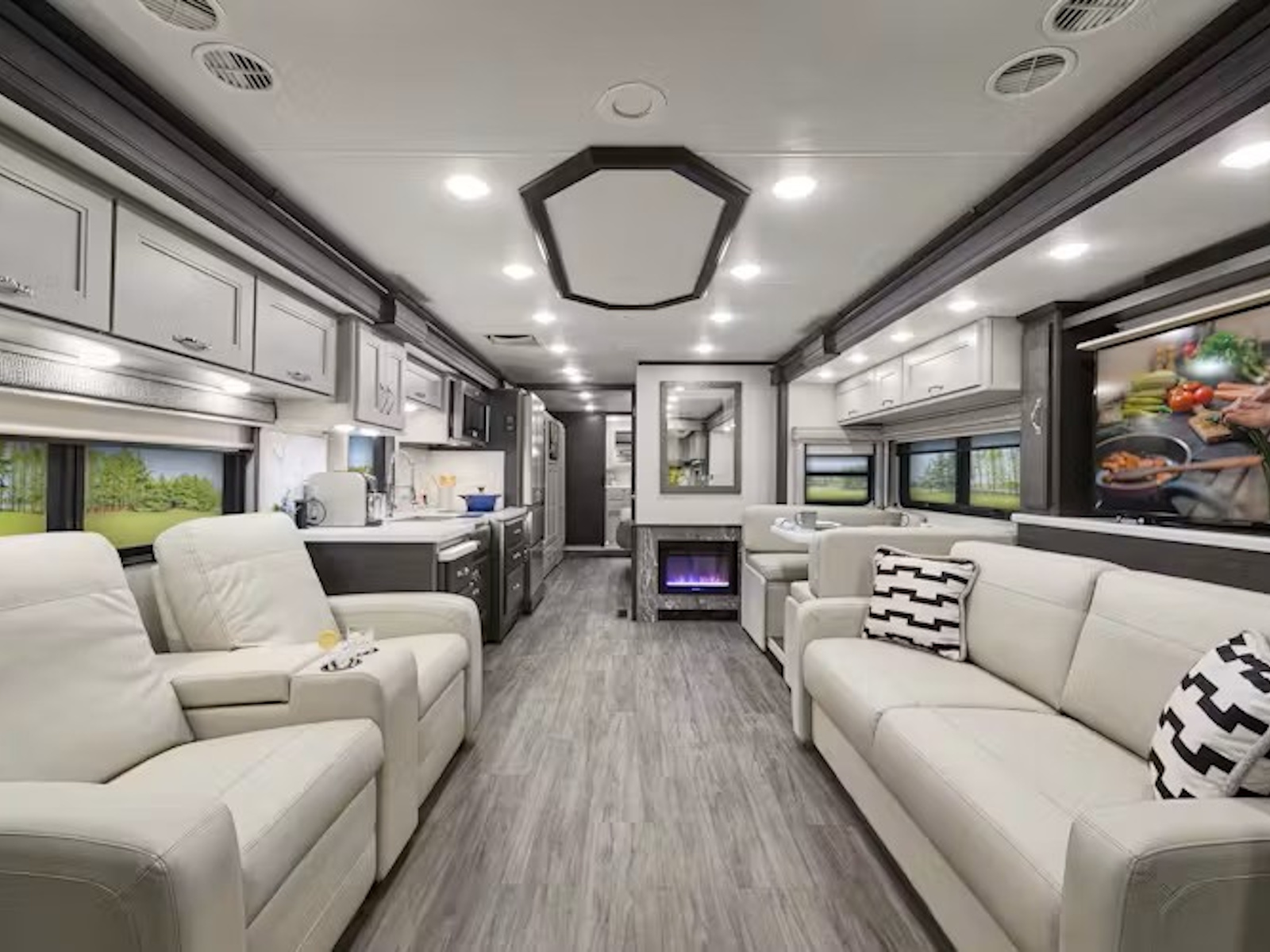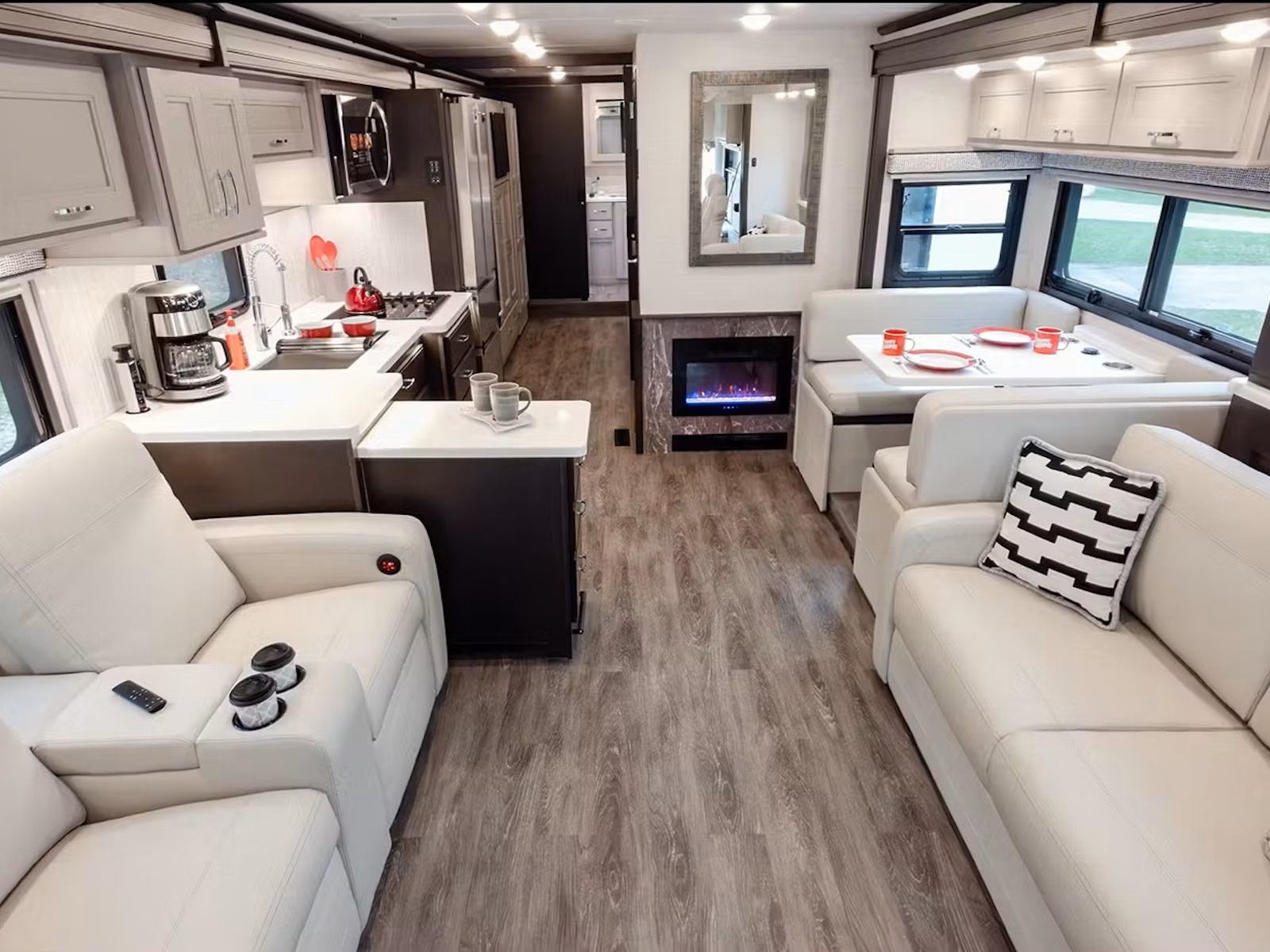 - Every Riviera™ is designed for stylish comfort and easy living, featuring a spacious Dream Dinette® for meals and a central vacuum system for quick cleanup. Most models include leatherette power reclining theater seating with footrests, heat, massage, and USB ports, while some offer a sofa bed for added lounging space. The 38RB layout even includes a cozy electric fireplace. Control it all effortlessly thanks to the Rapid Camp+® multiplex wiring system with SurgeGuard® electrical protection, allowing you to manage power, lighting, tank levels, and more from the 7-inch touchscreen or a Wi-Fi-enabled device.