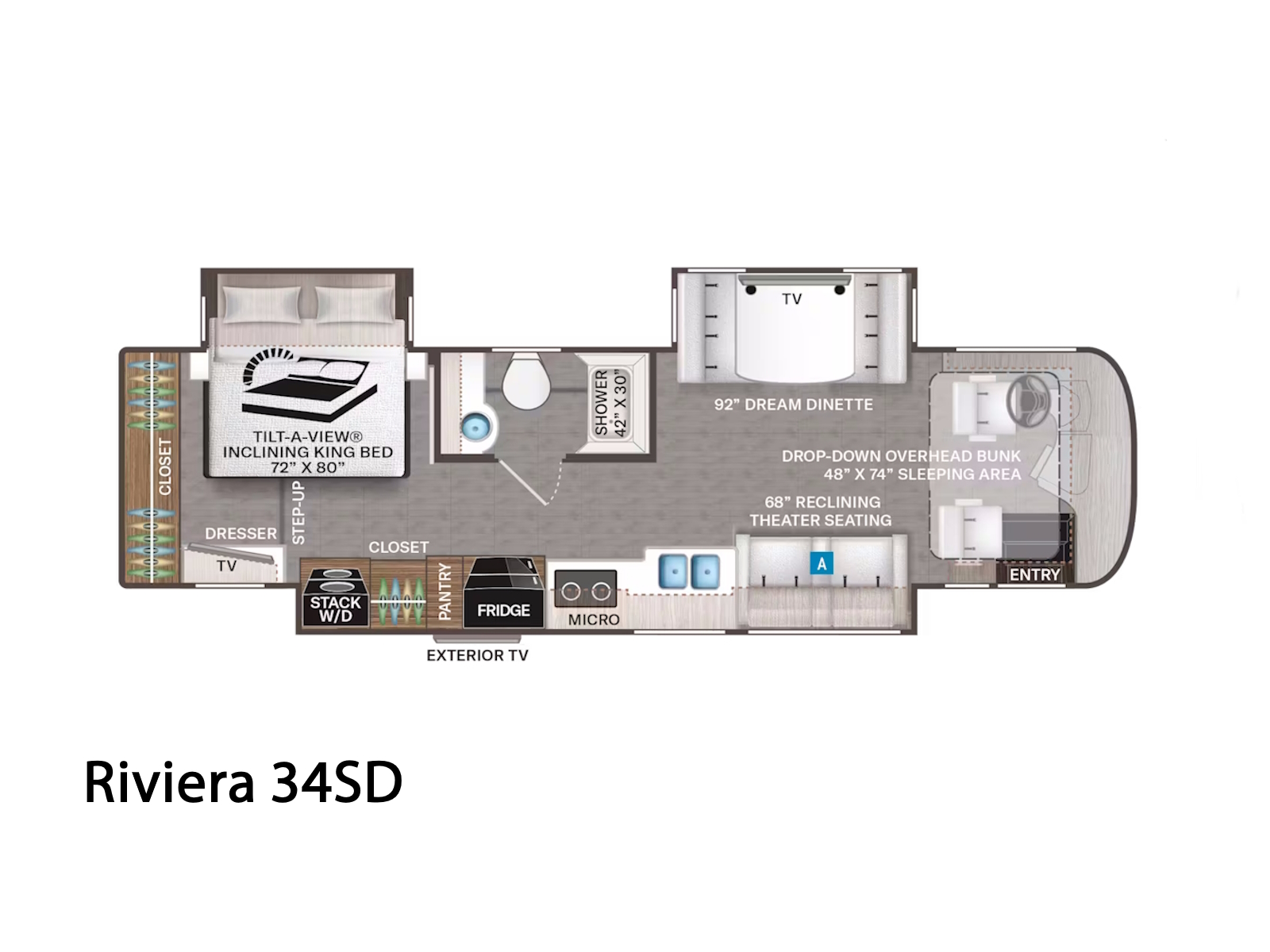 - After a day of adventure, unwind in the Riviera™ diesel pusher’s Tilt-A-View® bed. The 39BH floor plan features a cozy Queen-size bed, while the 38RB and 34SD layouts feature a luxurious King. If you’re hosting guests, the 38RB and 39BH offer a leatherette sofa bed, while the 39BH also includes versatile bunk beds that convert into a closet. Every model has a power drop-down overhead bunk featuring a Cotton Cloud™ mattress for extra sleeping space. For added convenience, each nightstand includes a wireless charging puck with a USB port to keep your devices powered up.