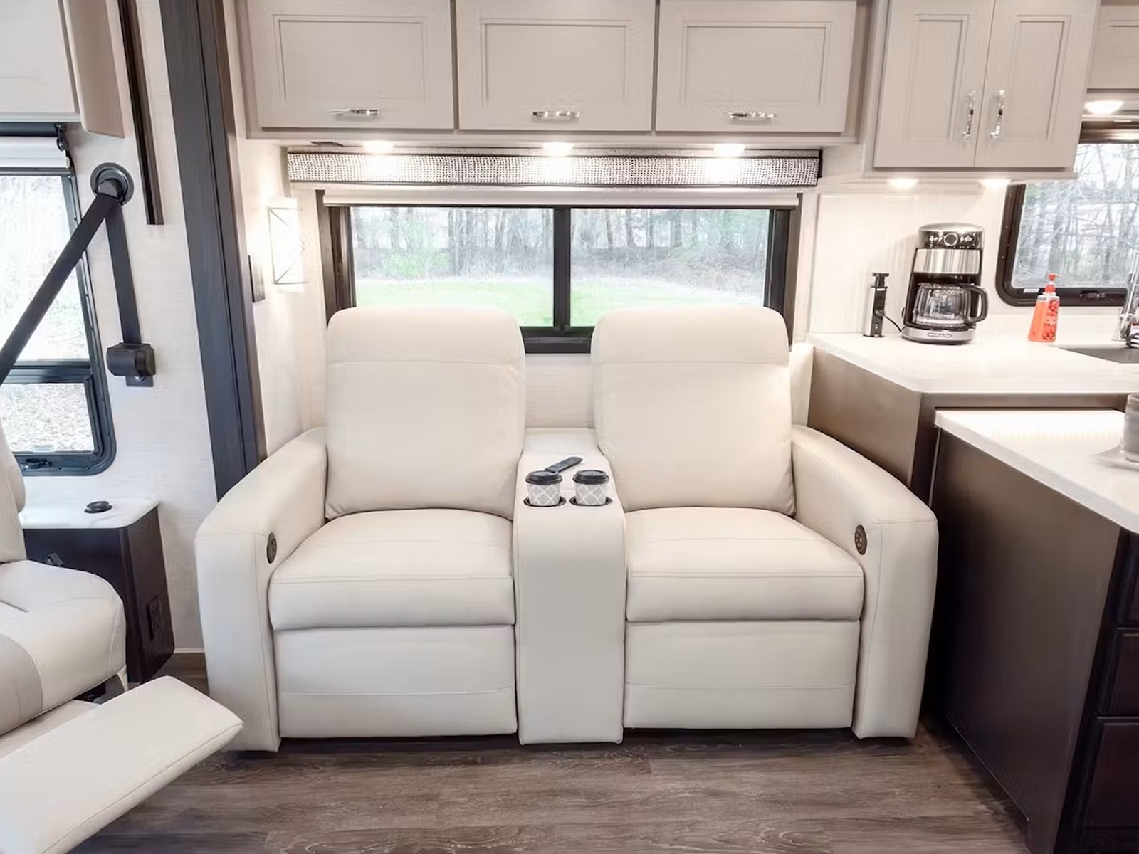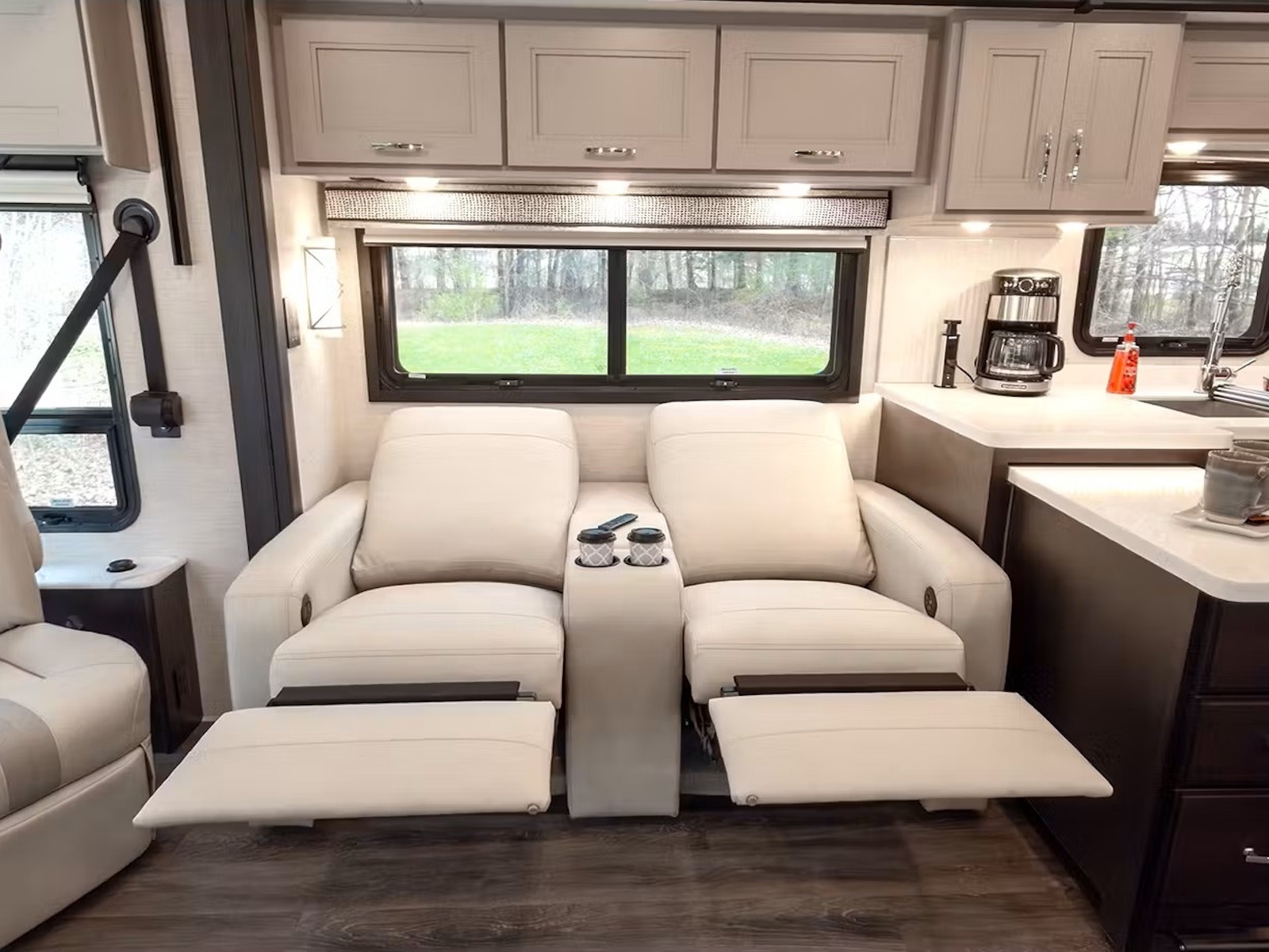 - Create meals on the go in the Riviera™. Whether using the two-burner gas range with a single-burner electric induction cooktop or the convection microwave oven with an air fryer, you’ll have everything you need for quick snacks or full meals. Keep ingredients fresh in the residential refrigerator, and power your kitchen gadgets with the countertop’s pop-up wireless phone charger, including built-in outlets and USB ports. After cooking, cleanup is easy with the stainless-steel double-bowl sink. Afterwards, dry and store your dishes quietly, thanks to this RV’s soft-close drawer guides.