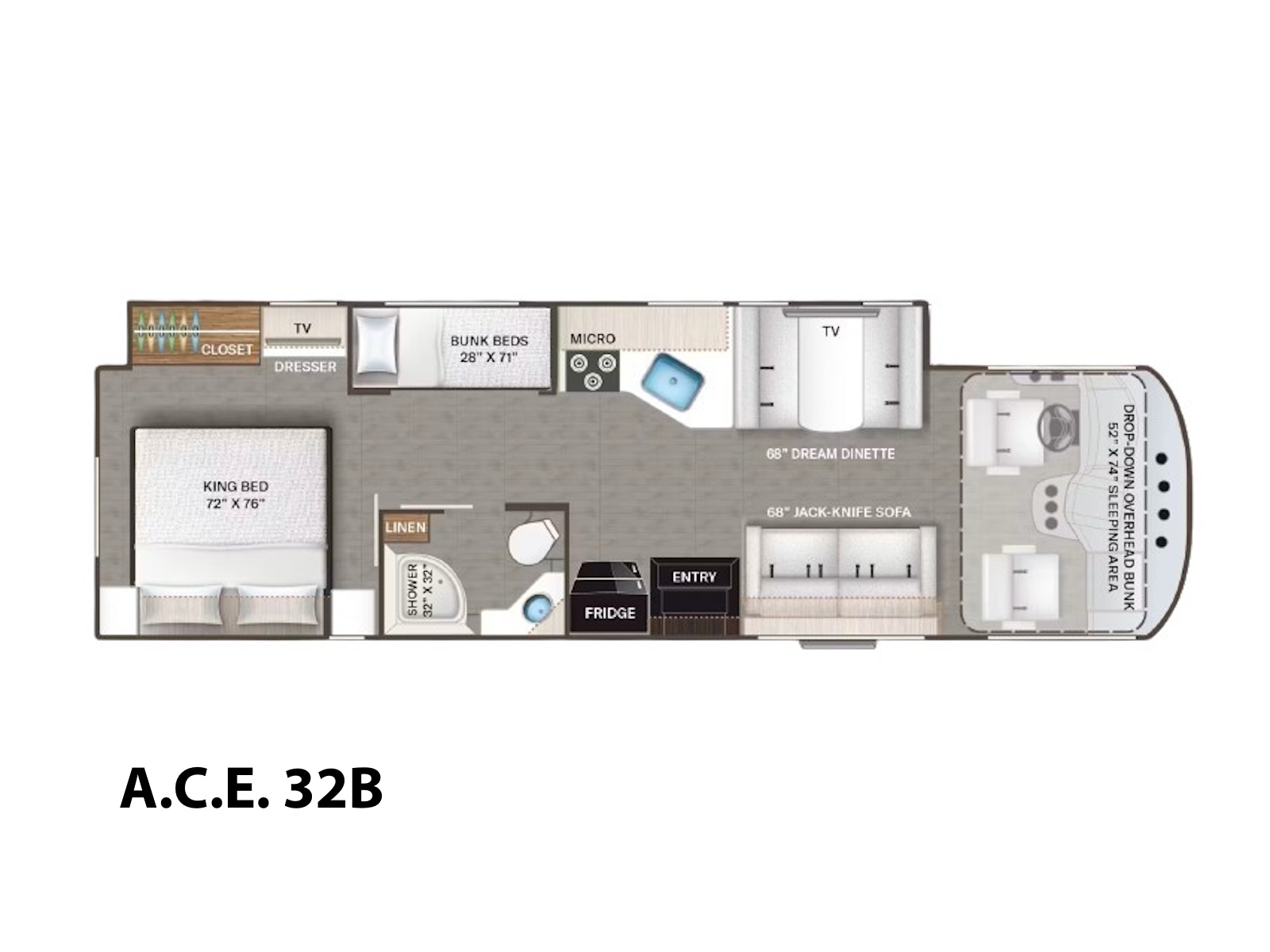 - Experience luxury and comfort on the go when you travel in the A.C.E.® motorhome. Lay down on the King-size bed and plug your CPAP machine into the convenient 110-volt bedroom outlet if needed. If you require additional sleeping space for friends or family, use the Dream Dinette® booth that transforms into a sleeping area, the power drop-down overhead bunk, or the bunk beds in the 32B floor plan.