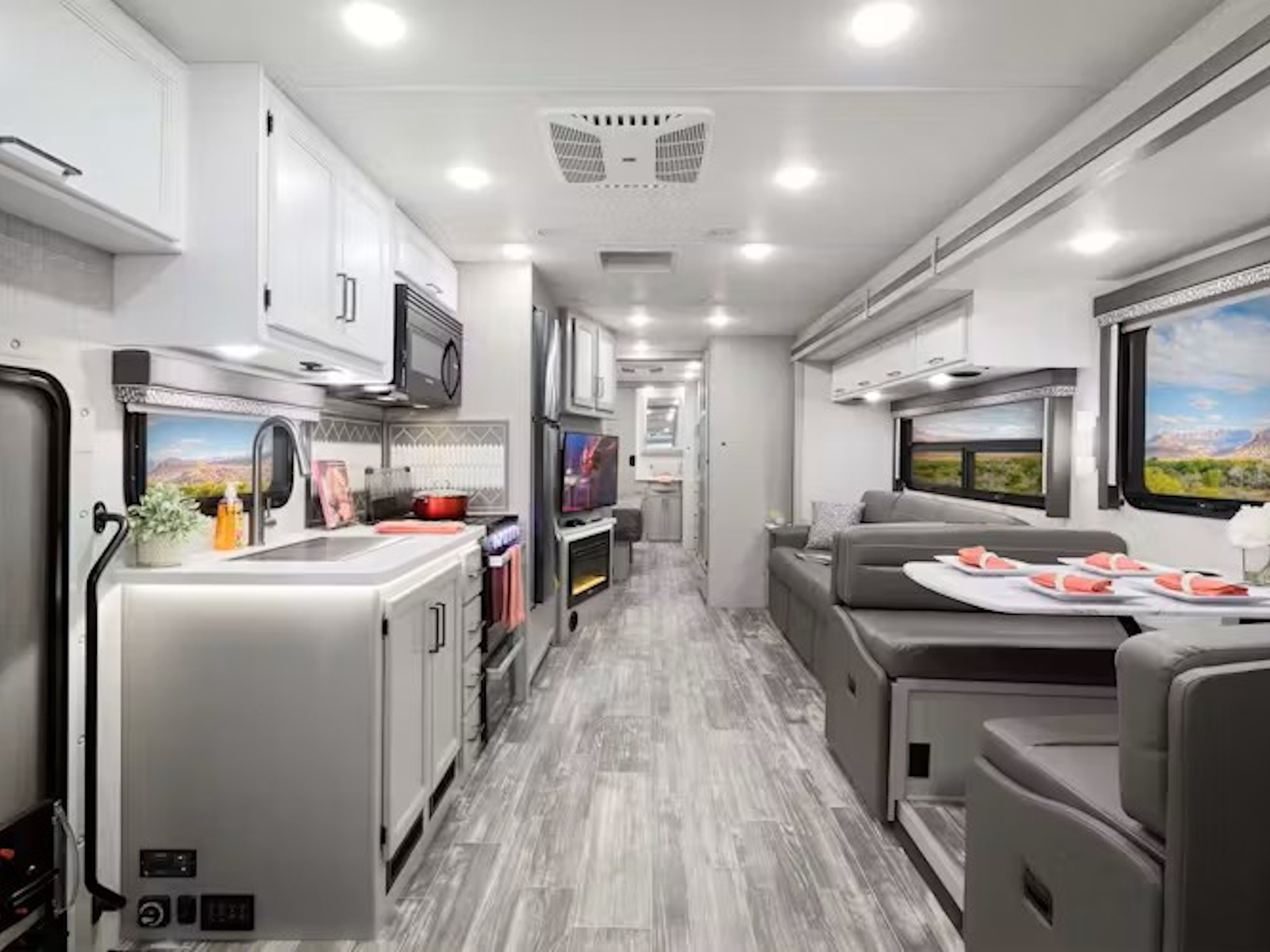• Whether traveling as a large family or hosting guests, the Hurricane® is built for gatherings. With flexible seating throughout, there's always room to relax in this Class A RV. Every floor plan includes a Dream Dinette® and a leatherette sofa bed, great for daytime lounging and converting into extra sleeping space at night. For added comfort, the 35R model comes with theater seating and integrated footrests, while the 29L offers this setup as an option. Thanks to the 35G’s cozy electric fireplace, you can keep warm on chilly nights at the campsite.