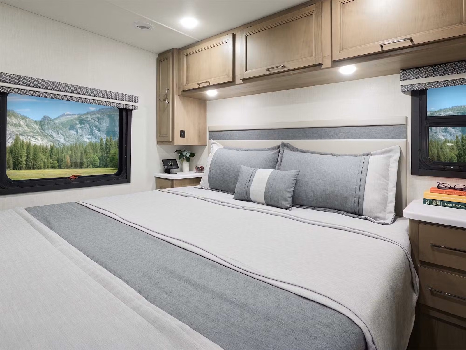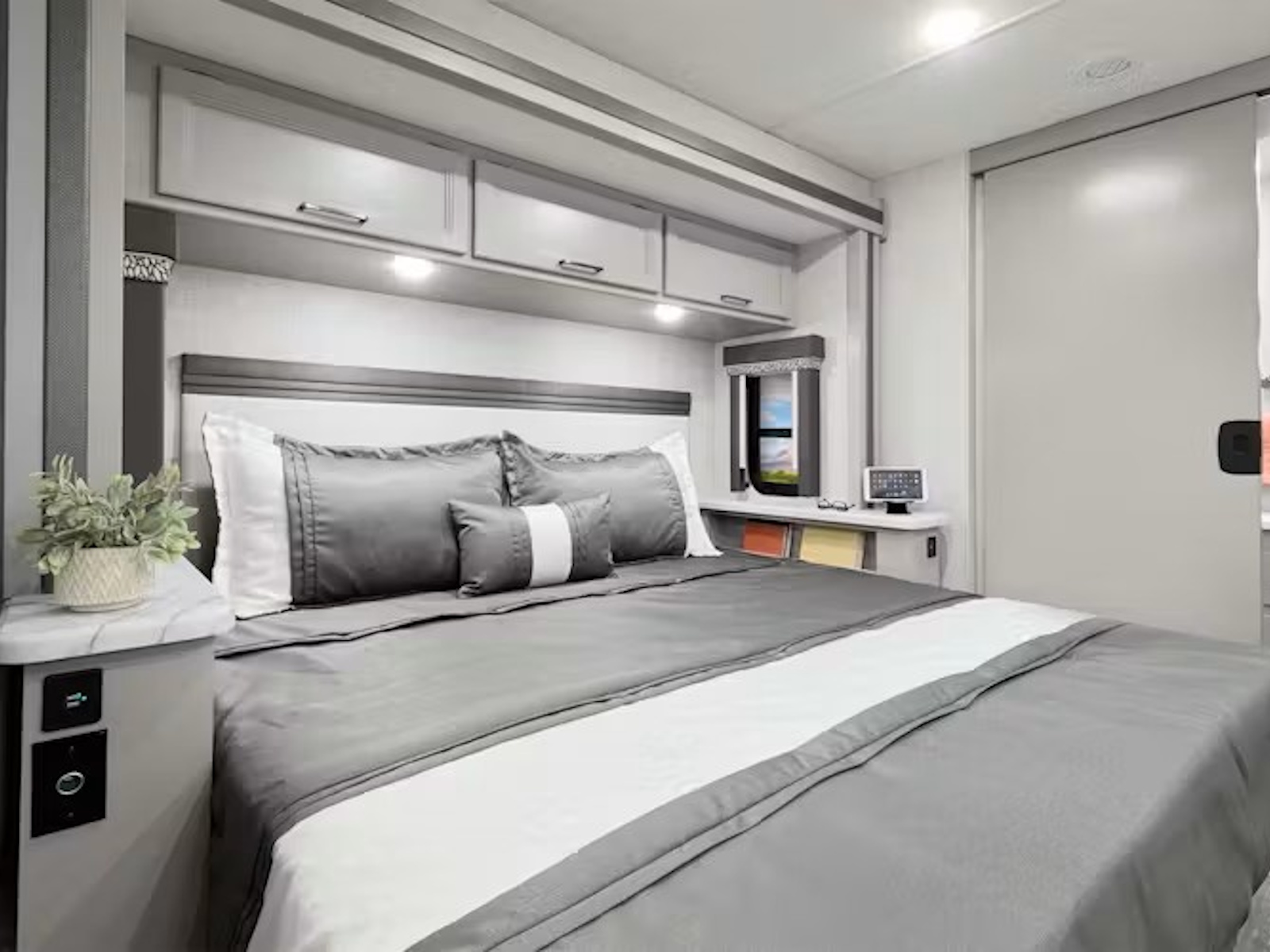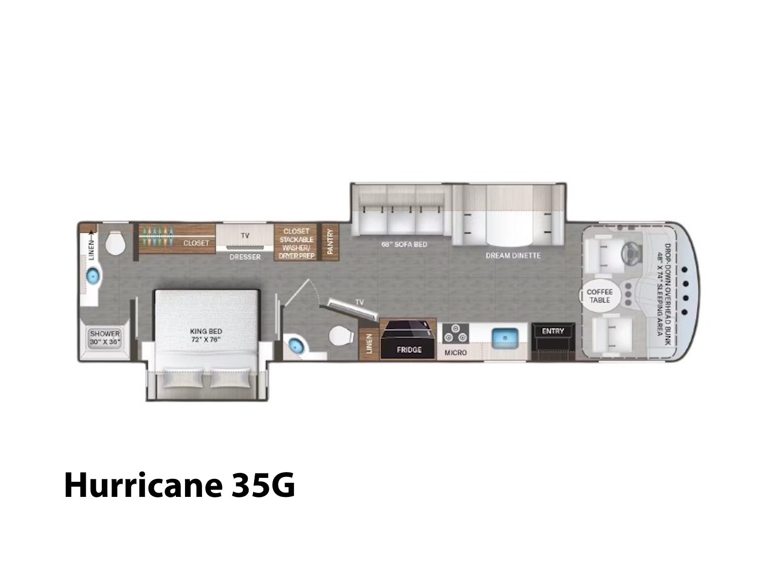 - After a day of adventure, the Hurricane® offers a relaxing retreat to rest and recharge. Every model features a luxurious King-size bed with a designer headboard, bedspread, and pillow shams, bringing five-star comfort to life on the road. Are you traveling with family or extra guests in this Class A RV? The power drop-down overhead bunk, complete with a Cotton Cloud™ mattress and ladder, easily adds sleeping space. The 35J floor plan includes cozy bunk beds for even more room, perfect for kids.