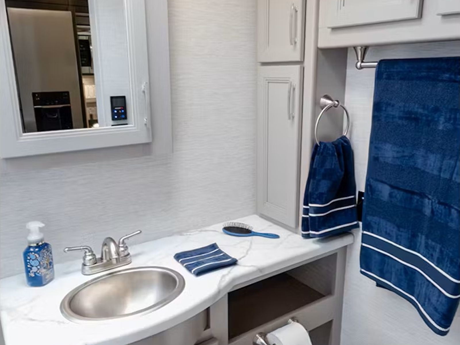 - Whip up a delicious meal wherever your adventures take you in the Indigo® using the three-burner gas cooktop/oven and the over-the-range convection microwave. All models include a pop-up charging station on the countertop to plug in cooking appliances and electronics. Keep your ingredients fresh in the residential refrigerator, and wash dishes easily post-dinner in the large stainless-steel single-bowl sink with a pull-down sprayer and a roll-up stainless-steel cover. The MM30 and GG35 floor plans also have a pantry cabinet onboard.
