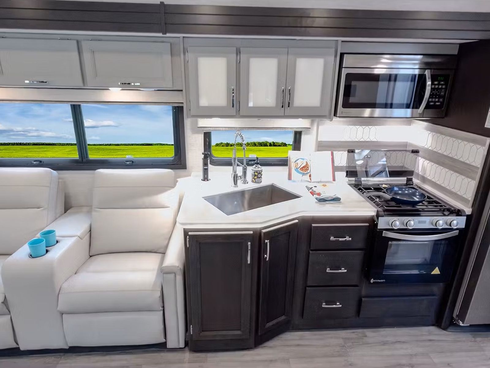 - Whip up a delicious meal wherever your adventures take you in the Indigo® using the three-burner gas cooktop/oven and the over-the-range convection microwave. All models include a pop-up charging station on the countertop to plug in cooking appliances and electronics. Keep your ingredients fresh in the residential refrigerator, and wash dishes easily post-dinner in the large stainless-steel single-bowl sink with a pull-down sprayer and a roll-up stainless-steel cover. The MM30 and GG35 floor plans also have a pantry cabinet onboard.