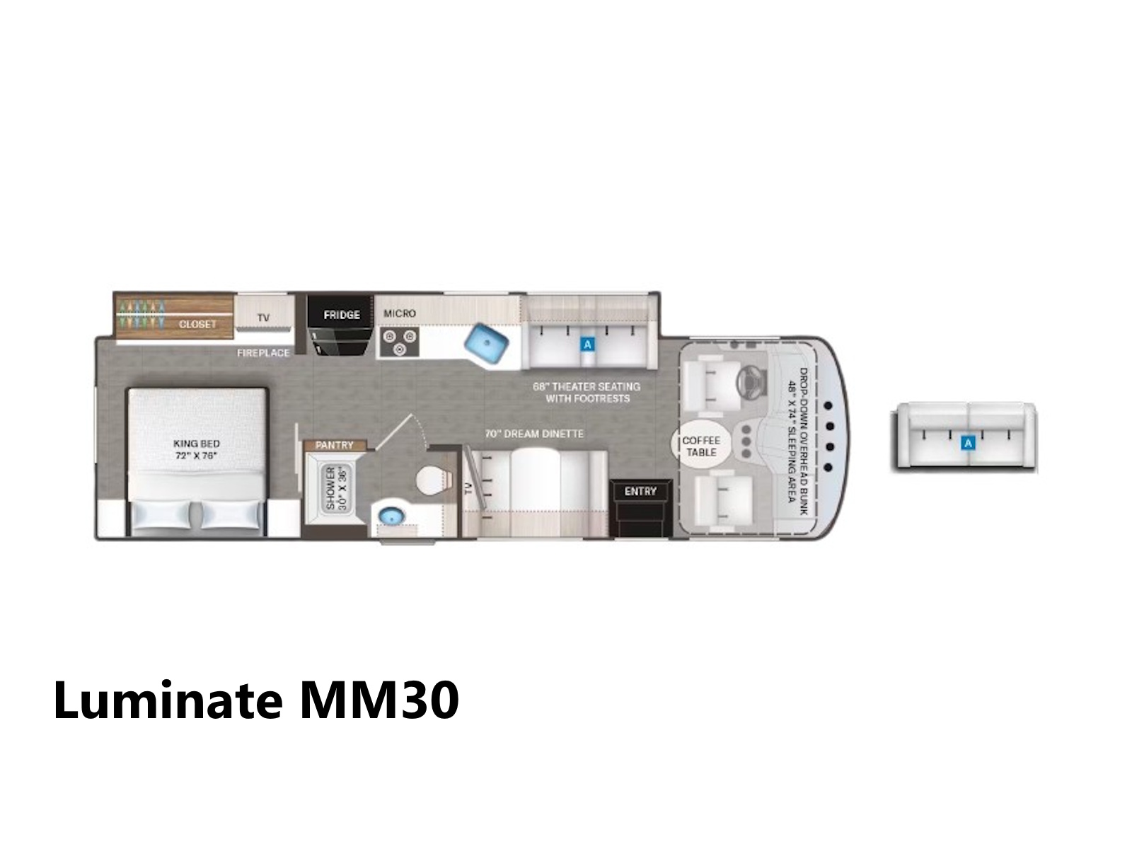 Perfect for large families, the Luminate® offers ample seating arrangements so everyone’s comfortable during your RV adventures. Each layout features a Dream Dinette® booth with a handy storage drawer and a wireless phone charger, enhancing your camping experience. All models also have power reclining theater seats with footrests, heat, massage, and USB charging ports for ultimate relaxation on the go. The CC35 floor plan takes it further with a sofa bed on board, while the other floor plans offer it as an option.