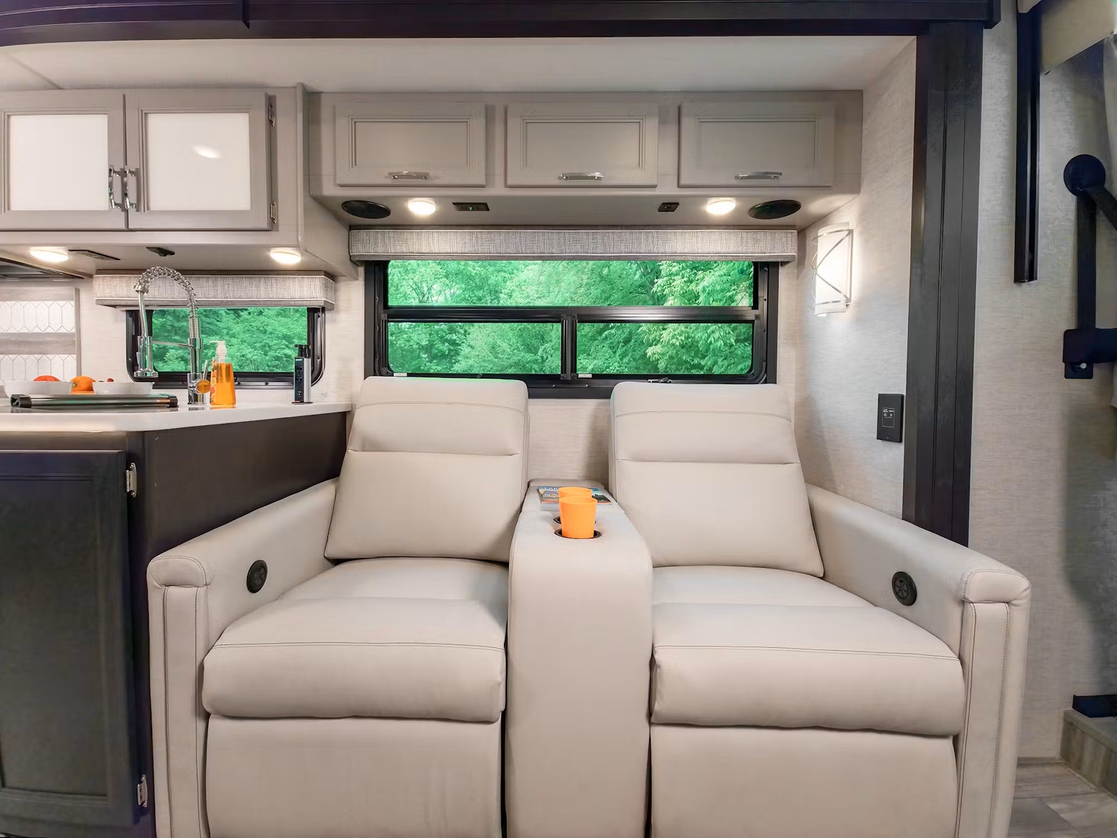 Whip up a delicious meal wherever your adventures take you in the Luminate® using the three-burner gas cooktop/oven and the over-the-range convection microwave. All models include a pop-up charging station on the countertop to plug in cooking appliances and electronics. Keep your ingredients fresh in the residential refrigerator, and wash dishes easily post-dinner in the large stainless-steel single-bowl sink with a pull-down sprayer and a roll-up stainless-steel cover. The MM30 and GG35 floor plans also have a pantry cabinet onboard.