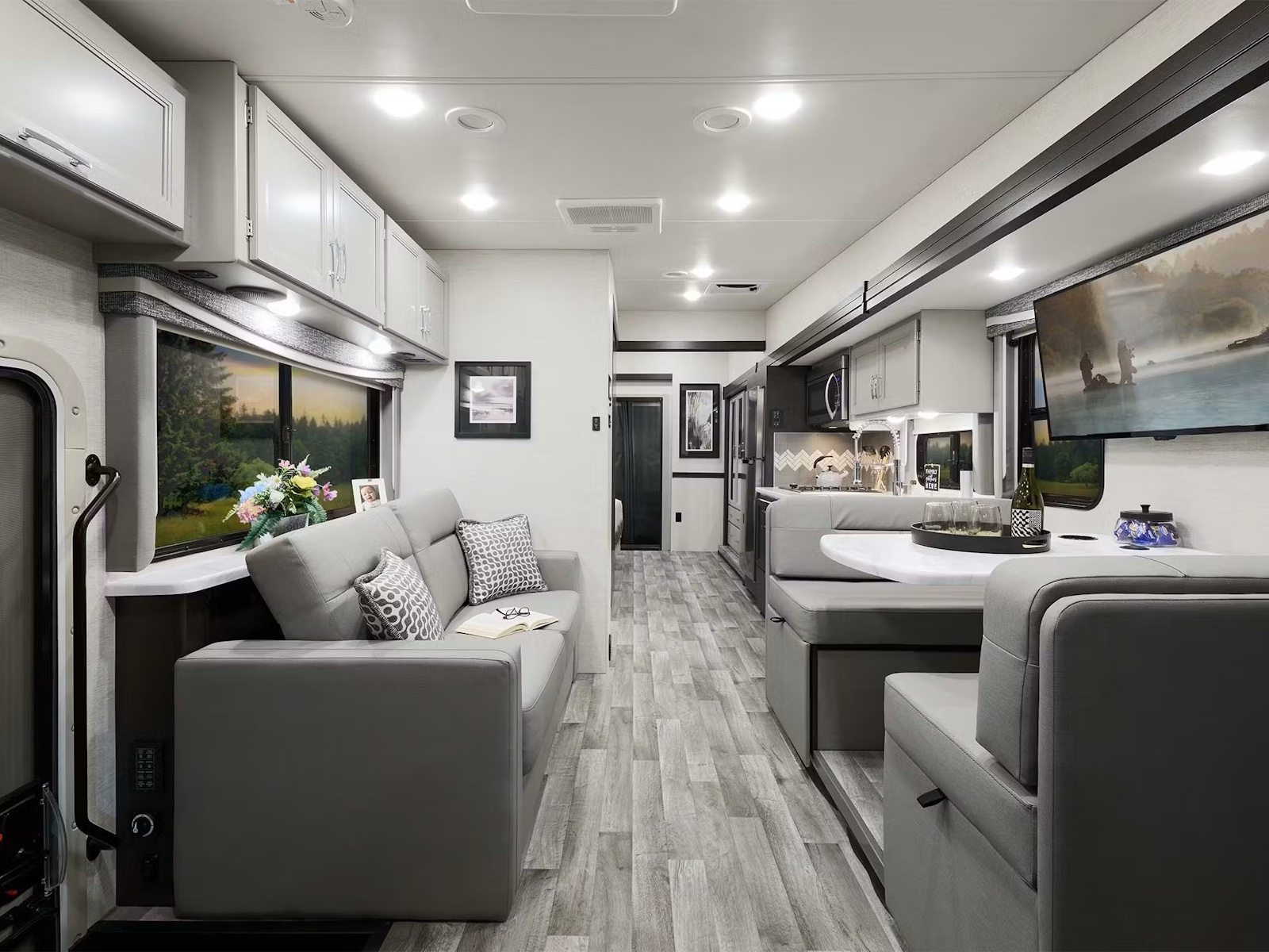 - Step into the Outlaw® and get ready to be impressed by its bold, stylish interior. With durable residential vinyl flooring and modern flat-panel cabinet doors, this toy hauler seamlessly blends comfort and design. As the sun sets, lower the window privacy roller shades and settle in for a cozy evening. The sofa bed effortlessly transitions from lounging to sleeping, while the Dream Dinette® booth, featuring built-in cup holders and a wireless phone charger with USB port, is ideal for everything from meals to map planning and late-night card games.