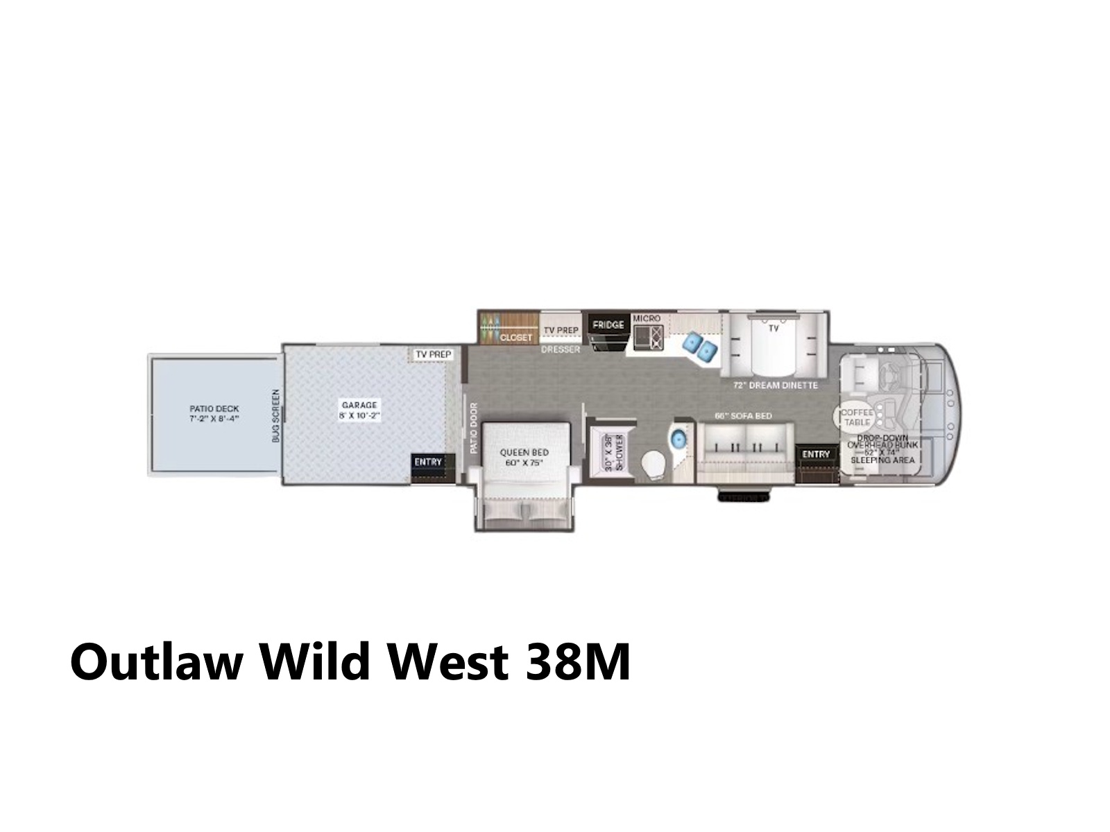 - Enjoy a great night’s sleep no matter where your travels take you in the Outlaw®. Snuggle up in the Queen-size bed of the 38M floor plan or catch up on your favorite book before dozing off, and let the day’s stress melt away in the 38K model’s Tilt-A-View® King-size bed with an inclining mechanism. For your convenience, a wireless charging puck with a USB port has been added to each nightstand. If friends or family want to sleep over, they can use the Dream Dinette® booth, the sofa bed, or the power drop-down overhead bunk.