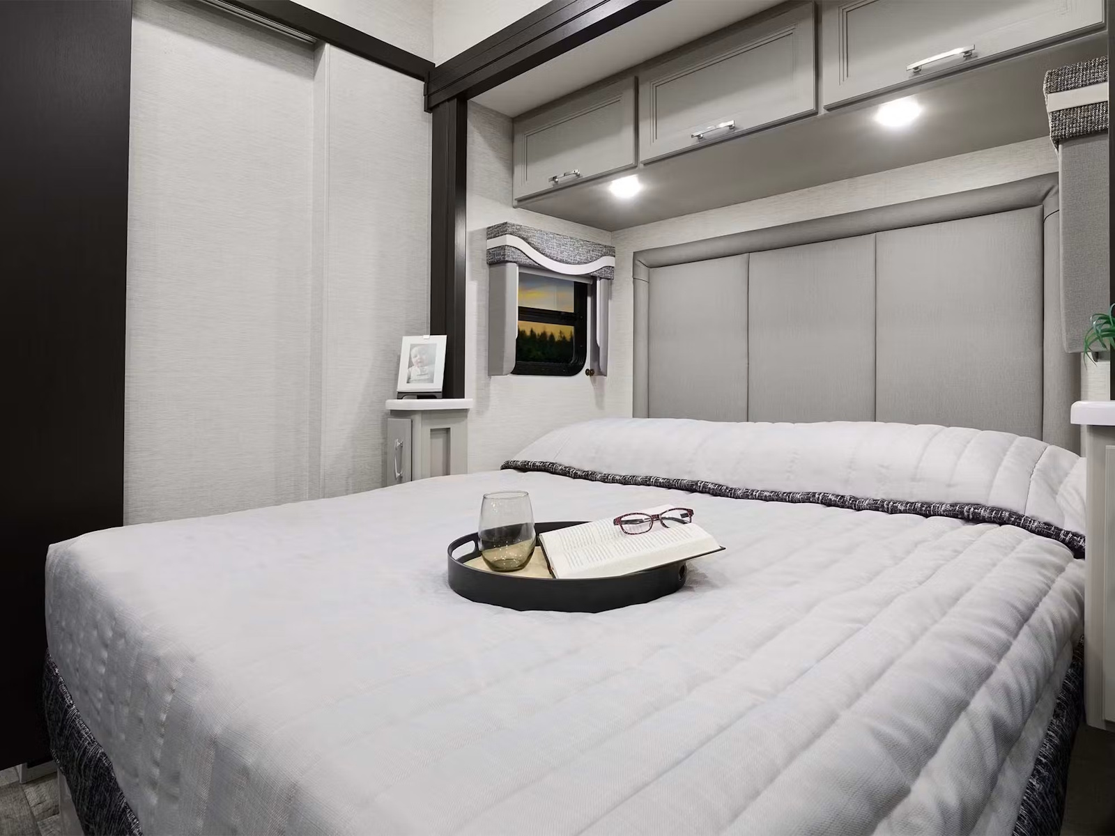 • Cook like a pro on the road in the Outlaw®. Whether using the two-burner gas range with a single induction cooktop or the convection microwave oven with built-in air fryer, you’ll have everything you need to whip up a great meal. A residential refrigerator keeps ingredients fresh, while the pop-up countertop wireless phone charger with outlets and USB ports makes it easy to power appliances and devices. After mealtime, wash dishes in the stainless-steel double-bowl sink, and use the soft-close drawer guides to tuck everything away quietly.