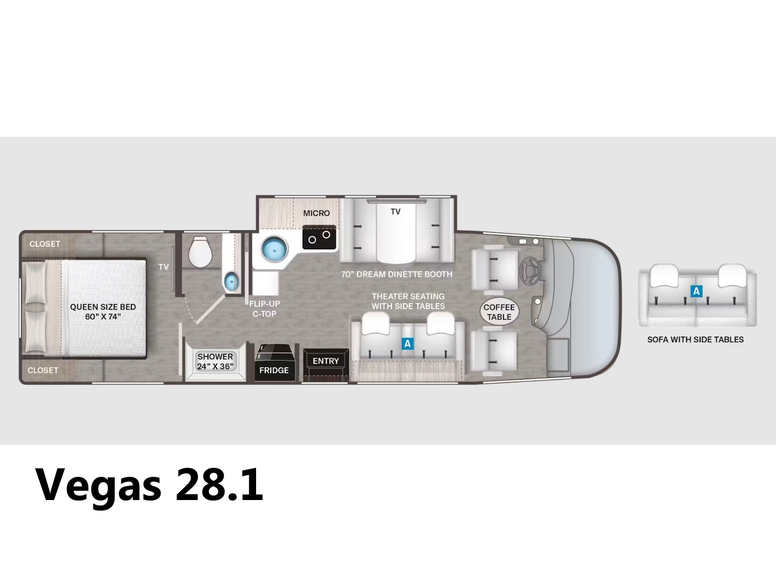 - Dive right into the Vegas® and admire its stunning interior design. The window privacy roller shades onboard block out light for added comfort and privacy, while the soft-close drawer guides help reduce noise. Unwind after a day of exploring on the leatherette theater seating with built-in footrests and adjustable side tables in the armrests, available in most floor plans. If you have the 24.1 model, you’ll enjoy a leatherette tri-fold sofa bed with the same convenient side tables built into the armrests. The 28.1 layout also has a Dream Dinette® booth for more seating.