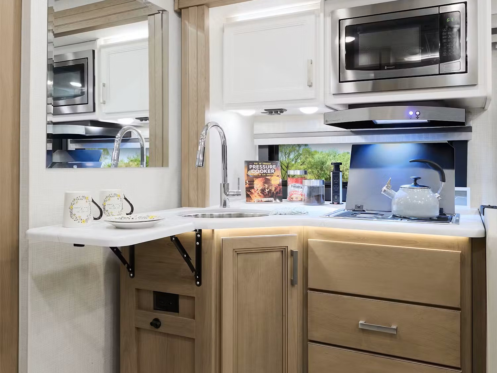 - Create yummy meals from the comfort of your Vegas® RV. This Class A motorhome has everything you need to create tasty treats on the go, including a 12-volt double-door refrigerator, a two-burner gas cooktop, and a convection microwave oven with an air fryer. Clean-up is a breeze thanks to the large stainless-steel single-bowl sink with a convenient pull-down sprayer. The 24.1, 26.2, and 28.1 floor plans also have a flip-up countertop extension for more prep space.