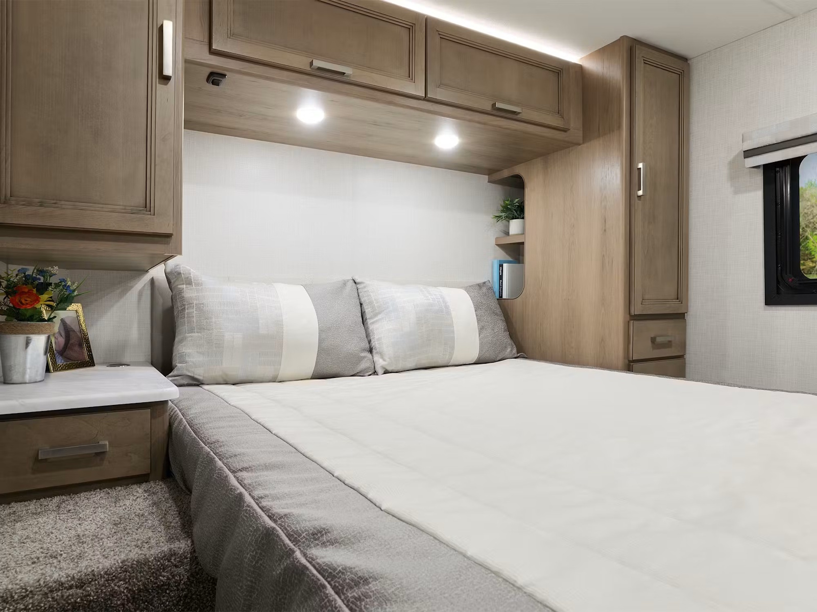• Wake up feeling fully recharged after a peaceful night’s sleep in this small Class A motorhome. The 26.1 and 28.1 floor plans provide a comfortable Queen-size bed, while the 24.1 and 26.2 models have a flexible Twin-to-King conversion bed. Are you traveling with kids or guests? Every Vegas® floor plan offers the option of a power drop-down overhead bunk, complete with a Cotton Cloud™ mattress and bunk ladder, perfect for creating extra sleeping space without sacrificing comfort.