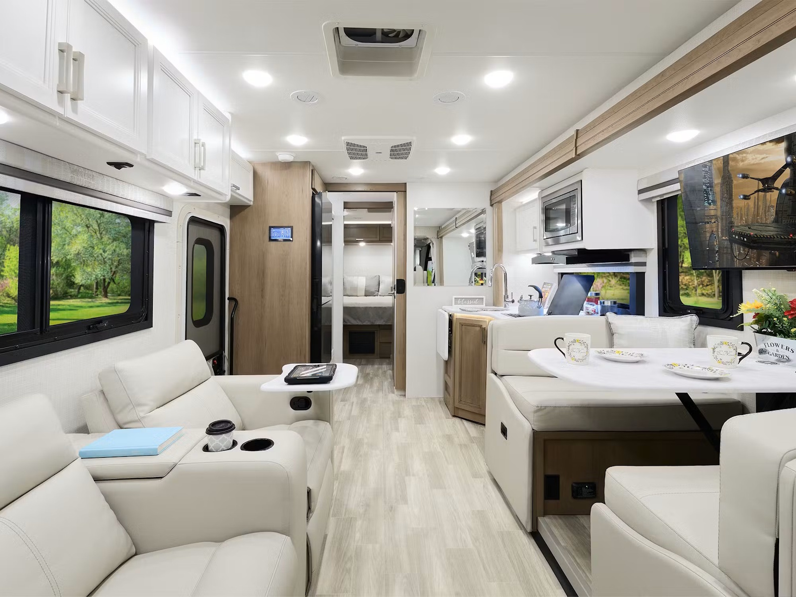 • Dive right into the Vegas® and admire its stunning interior design. The window privacy roller shades onboard block out light for added comfort and privacy, while the soft-close drawer guides help reduce noise. Unwind after a day of exploring on the leatherette theater seating with built-in footrests and adjustable side tables in the armrests, available in most floor plans. If you have the 24.1 model, you’ll enjoy a leatherette tri-fold sofa bed with the same convenient side tables built into the armrests. The 28.1 layout also has a Dream Dinette® booth for more seating.