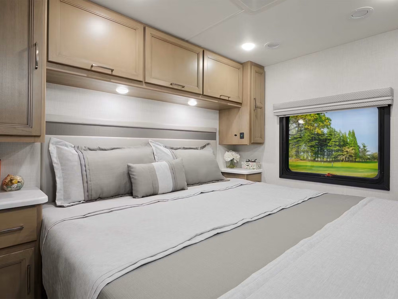 - When it’s time to wind down, the Windsport® is the perfect place to relax and recharge. With a luxurious King-size bed in every model featuring a designer headboard, bedspread, and pillow shams, you’ll feel like you’re sleeping in a five-star hotel every night. If you’re traveling as a large family or with guests, use the power drop-down overhead bunk with a Cotton Cloud™ mattress and a bunk ladder. The 35J floor plan also has bunk beds, which little ones will especially love.