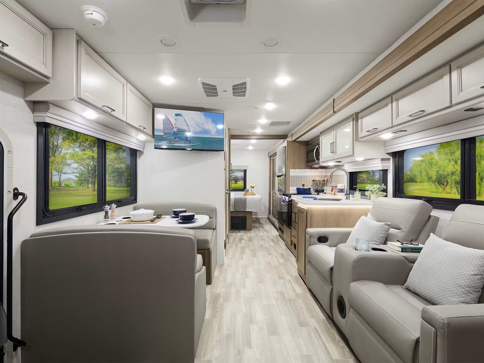 - If you have a big family or love to host, the Windsport® is the perfect RV! With various seating arrangements onboard, you’ll never have to worry about running out of space for your guests. Every model has a Dream Dinette® booth and leatherette sofa bed that can be used as comfortable seating during the day and an additional sleeping area at night. The 35R floor plan also has theater seating with integrated footrests, while the 29L offers this setup as an option. The 35G layout even has an electric fireplace for chilly nights at the campsite.