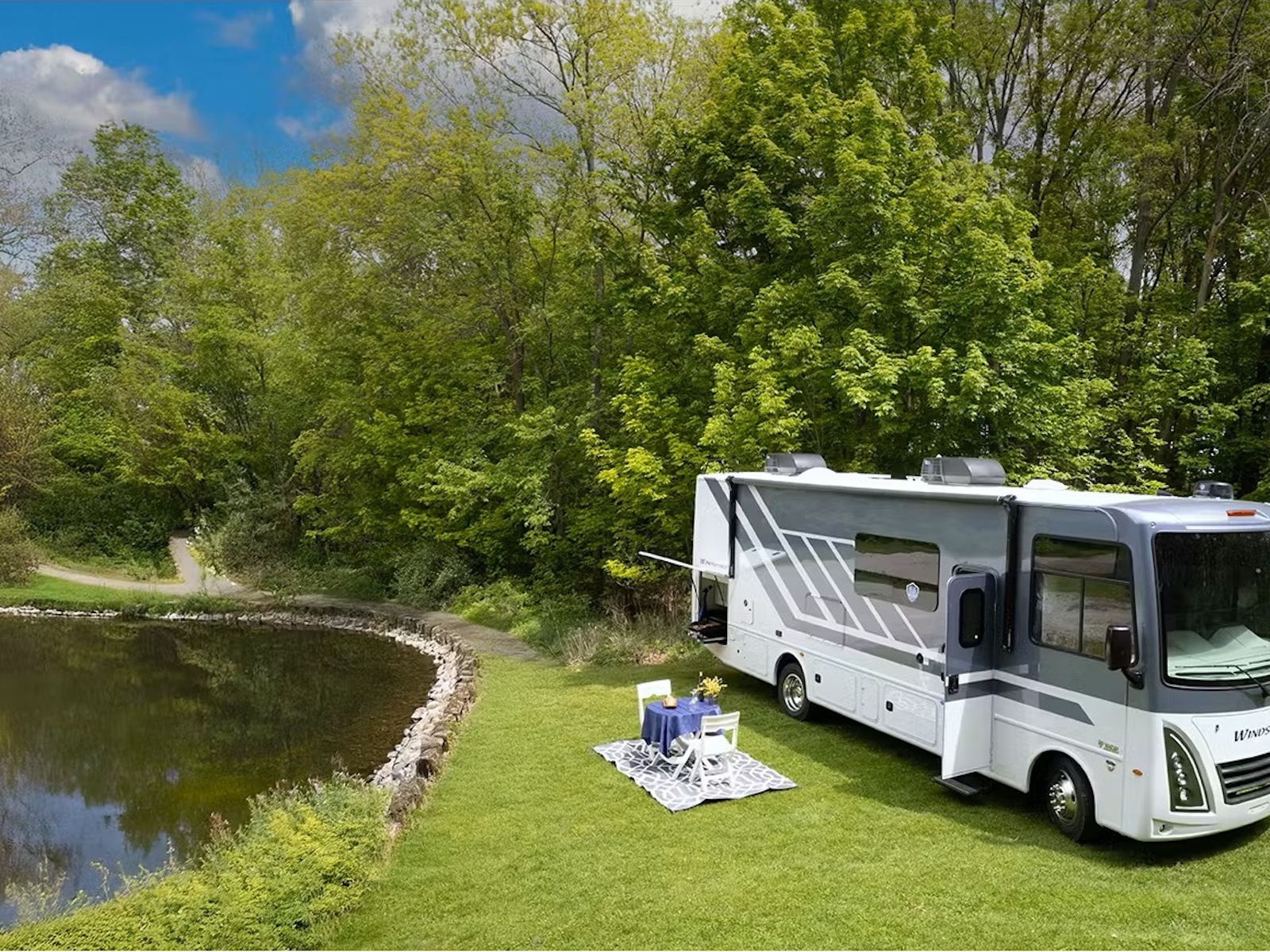 - The Windsport® is built on a Ford® F-53 chassis with an 8,000-pound trailer hitch, giving you the strength to tow your favorite gear. Enjoy a smooth drive with cruise control, heated/remote mirrors with built-in side-view cameras, and a sleek 14-inch touchscreen dash radio offering Bluetooth®, SiriusXM®, Apple CarPlay®, and Android Auto™. The Rapid Camp+® multiplex system puts control at your fingertips, letting you manage lighting, climate, tank levels, and auto-gen start from the 7-inch touchscreen or your phone via Bluetooth®.