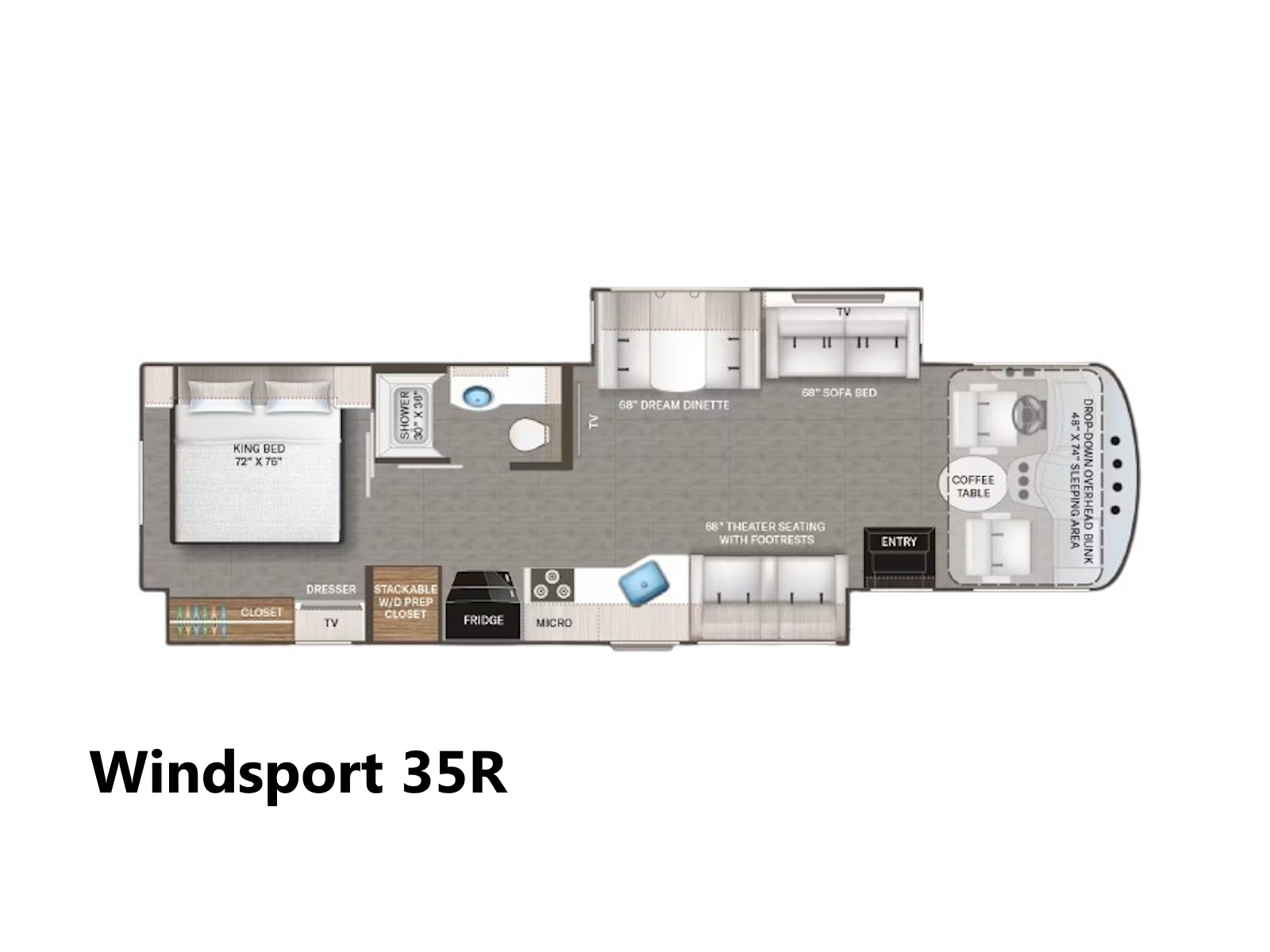 - If you have a big family or love to host, the Windsport® is the perfect RV! With various seating arrangements onboard, you’ll never have to worry about running out of space for your guests. Every model has a Dream Dinette® booth and leatherette sofa bed that can be used as comfortable seating during the day and an additional sleeping area at night. The 35R floor plan also has theater seating with integrated footrests, while the 29L offers this setup as an option. The 35G layout even has an electric fireplace for chilly nights at the campsite.