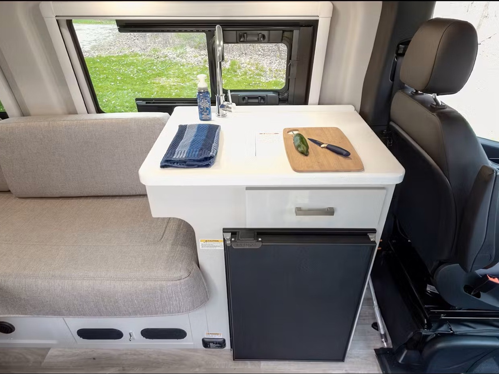 - Cook mouth-watering meals from the comfort of your Mercedes-Benz® Sprinter Van. The Sanctuary® motorhome has everything you need to create tasty treats on the go, including a 12-volt refrigerator, a single-burner induction cooktop, and a microwave oven. All models also have a versatile Laguna table system, which you can use to eat, work, or play games with loved ones and remove easily to save space. After dinner, wash dishes and utensils easily using the convenient stainless-steel single-bowl sink with a cover.
