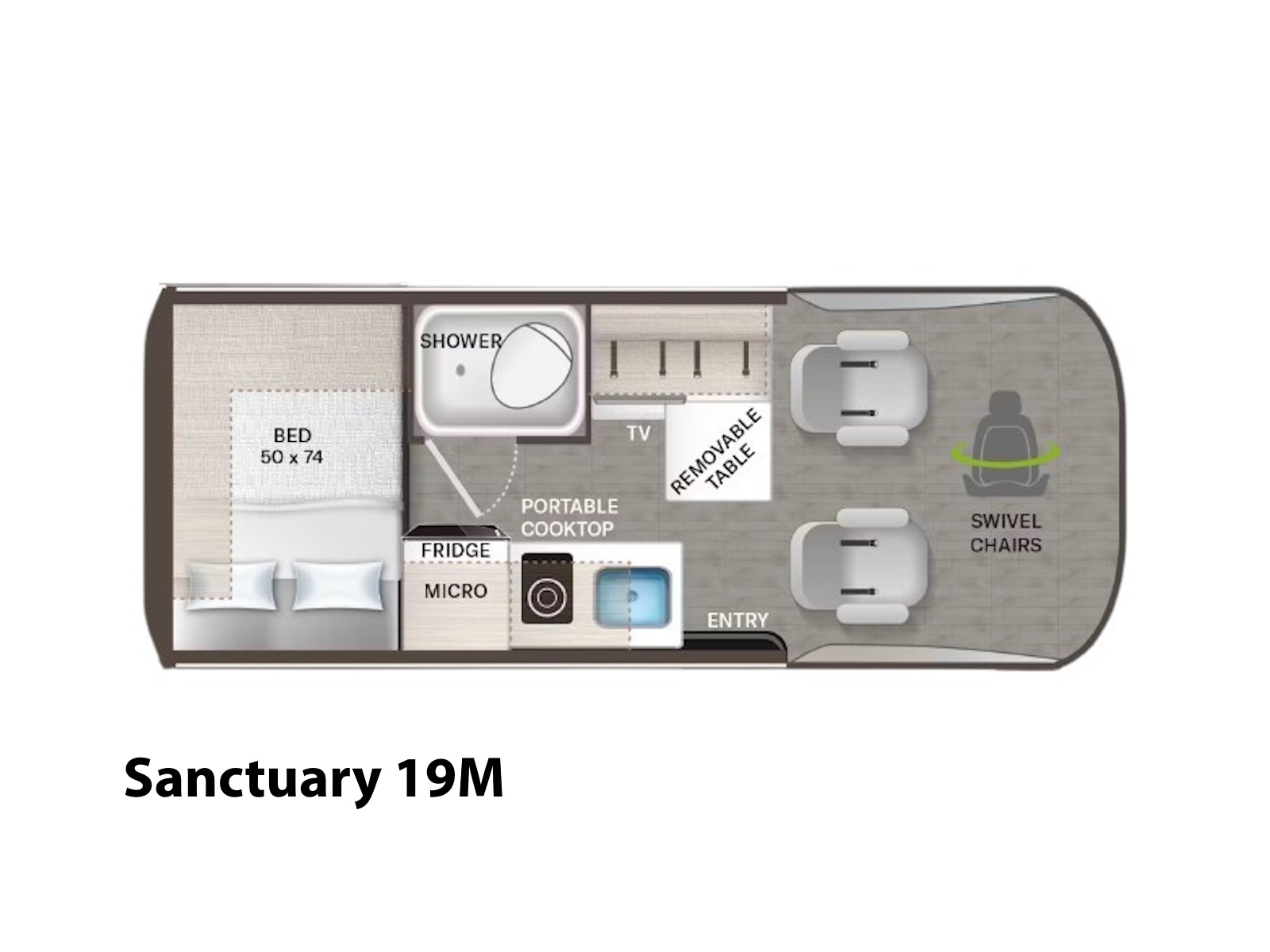 - Enjoy a great night’s sleep in the Sanctuary®. The 19P and 24C floor plans feature a rear fold-out sleeping area, perfect for unwinding after exploring. In the 19M, you’ll find a fold-up rear bed with a cargo area and a built-in locking storage compartment for extra convenience. If you need additional room to stretch out, the 19A floor plan delivers with twin beds that easily convert into a spacious King. For even more flexibility, the 24A includes twin sofa beds that transform into a King and a pull-out dinette bench that makes into an extra bed for guests.