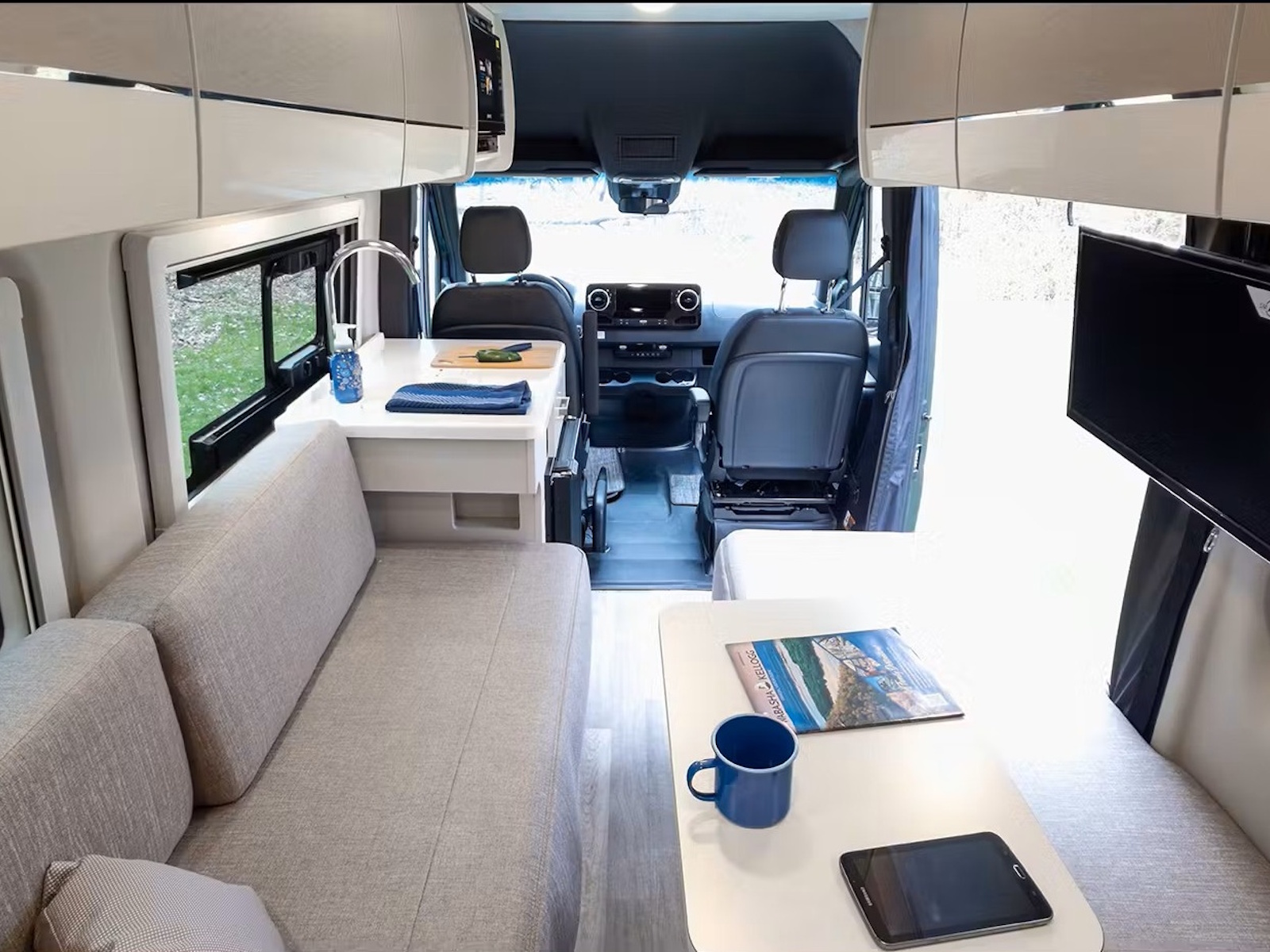 - Keep in touch with friends on your camping trips using the Winegard® ConnecT™ 2.0 4G system, your all-in-one Wi-Fi extender, 4G hotspot, and TV antenna. The Sanctuary® is prepped for Starlink satellite internet so you can stay connected no matter the destination. Enjoy your favorite shows on the 24-inch Smart TV in the living area of all models. The 24C and 24A floor plans also have a flip-down TV in the front overhead to enhance your viewing experience. Plus, enjoy all the entertainment you need on the go with the Mercedes-Benz® 10.25-inch multimedia dash radio, featuring Bluetooth®, SiriusXM®, and navigation capabilities.