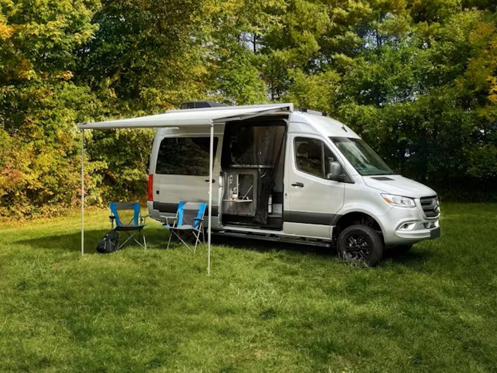 - Elevate your camping adventures in the Sanctuary®, a Sprinter Van built for excitement with its off-road tire and wheel package, optional Thule® bike rack, and top-mount LED light bar for nighttime exploration. After a day of cycling or hiking, relax under the Thule® lateral arm power patio awning in the 19P, 19A, and 19M floor plans or the armless awning in the 24A and 24C models, all featuring integrated LED lighting. Stay powered off-grid with the 200-watt solar charging system and 30-amp controller, plus an exterior solar port for connecting portable panels when the roof-mounted one is shaded.