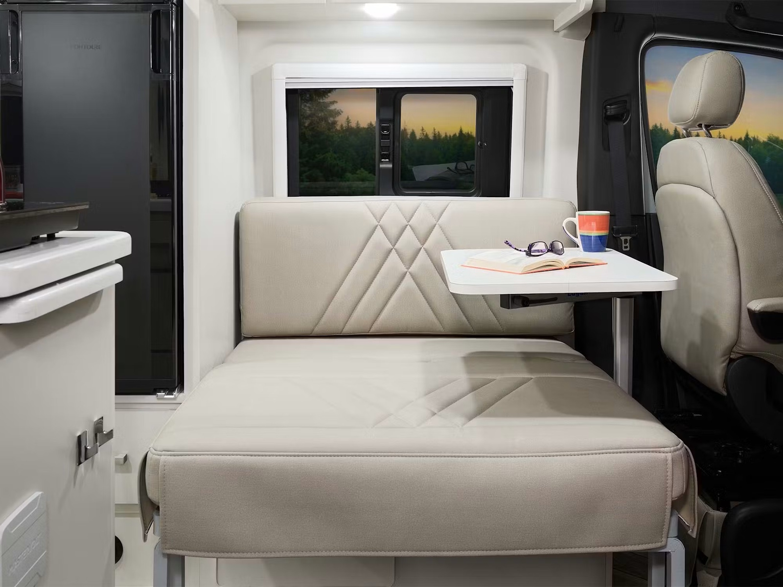 - Enhance your adventures with the Sanctuary®. Pack everything from hiking equipment to warm blankets in the roomy upper cabinets, which boast sleek Euro-style doors for a luxurious indoor feel. Say goodbye to stubborn dirt and mud with this van’s residential vinyl flooring, perfect for post-adventure cleanup. For privacy, pull down the cassette shades and minimize noise with the soft-close drawer guides available on all floor plans. Keep your living area cozy with an Aqua-Hot® diesel furnace and water heater combo system, and cool down after your big adventures with the energy-efficient, power-saving air conditioner.