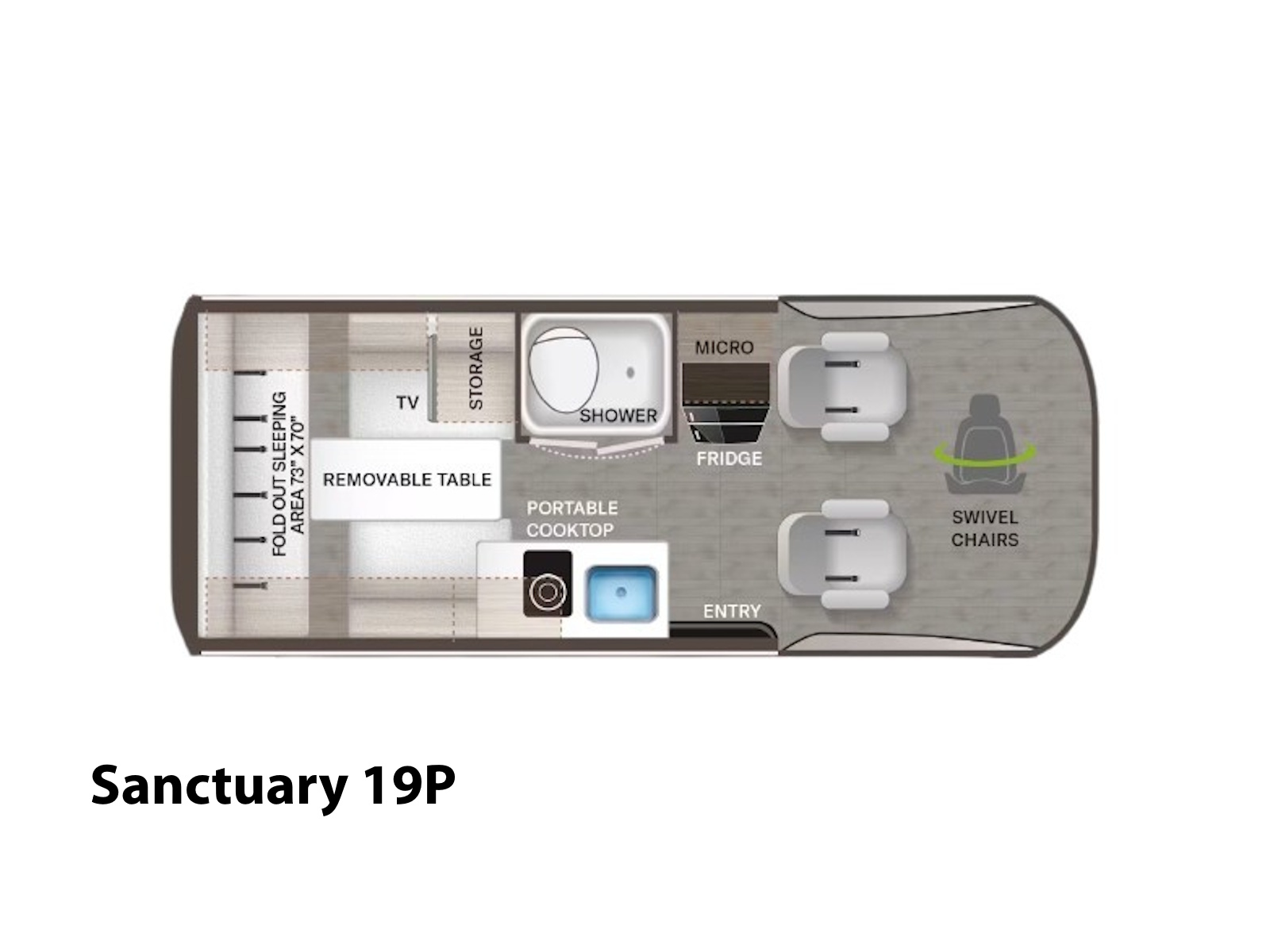 - Enjoy a great night’s sleep in the Sanctuary®. The 19P and 24C floor plans feature a rear fold-out sleeping area, perfect for unwinding after exploring. In the 19M, you’ll find a fold-up rear bed with a cargo area and a built-in locking storage compartment for extra convenience. If you need additional room to stretch out, the 19A floor plan delivers with twin beds that easily convert into a spacious King. For even more flexibility, the 24A includes twin sofa beds that transform into a King and a pull-out dinette bench that makes into an extra bed for guests.