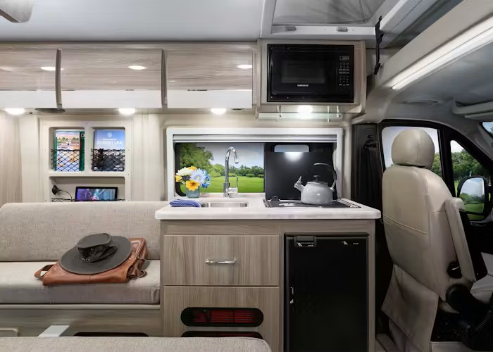 - Create delicious bites in the Rize® adventure van, packed with all the cooking essentials you need, whether parked by the beach or in the mountains. Store your ingredients in the handy 12-volt single-door electric refrigerator. Whether you’re craving a quick snack or preparing a full meal, the two-burner gas cooktop and microwave oven in this convenient kitchen are ready to help. Post-dinner cleanup is simple in this small Class B motorhome thanks to the stainless-steel single-bowl sink with a cover and a single-handle faucet.