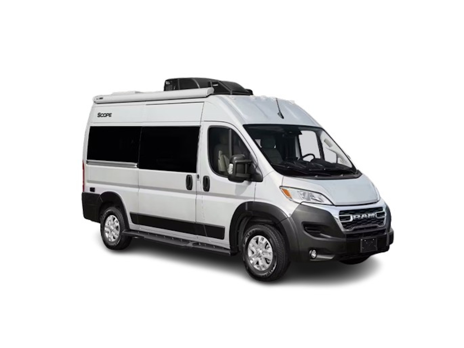 - Hit the road in the Scope® camper van, built on the Ram ProMaster® 1500 XT chassis and powered by a 3.6-liter V6 engine with front-wheel drive for a smooth ride. Advanced safety features like attention assist, traffic sign assist, active lane keeping assist, and blind spot assist help keep your journey stress-free. Tow your gear using the 5,000-pound hitch, and enjoy modern conveniences like cruise control, keyless entry, sleek aluminum wheels, and a backup camera for added peace of mind.