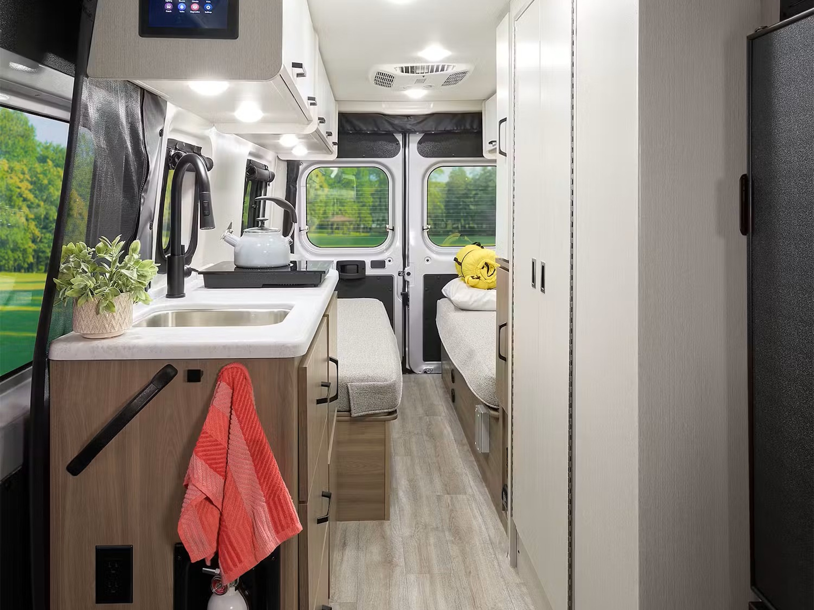 • Step into the Sequence® camper van and enjoy a modern, functional space. Sleek upper cabinets offer plenty of room for your gear, while bench-style seating easily converts into a bed for restful nights. Swiveling captain’s chairs add to the living area when parked, while the privacy shades help block out light when you want to sleep in. Manage lighting, climate, tank heaters, the generator, and more from the touchscreen or a connected device thanks to the Rapid Camp+® system by Firefly Integrations.