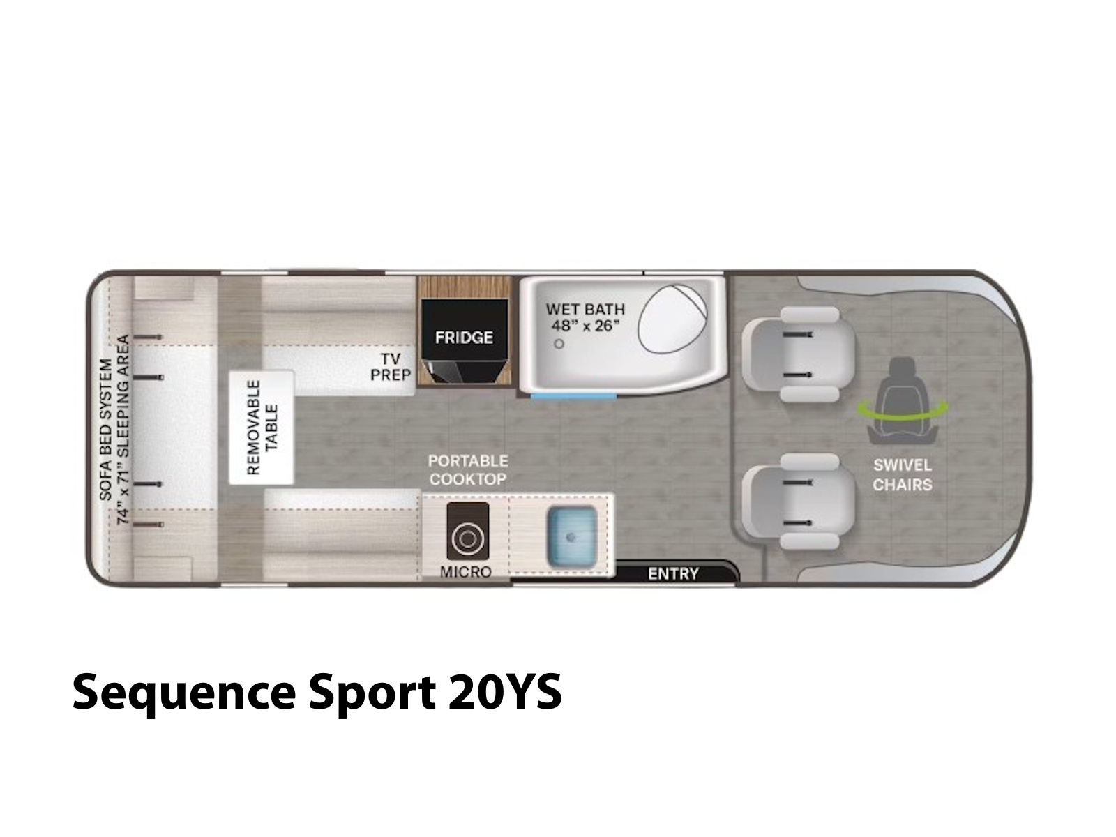 - Cook delicious meals on the road in the Sequence® camper van’s well-equipped kitchen, featuring a single-burner induction cooktop. Keep your ingredients fresh thanks to the 12-volt single-door fridge in the 20L and 20LS floor plans or pick between the 20U, 20Y, 20US, and 20YS if you prefer a double-door refrigerator. Warm up leftovers in the microwave and quickly rinse off dishes in the stainless-steel single-bowl sink. If you need to power up a coffee maker or blender, use the pop-up outlet on the countertop.