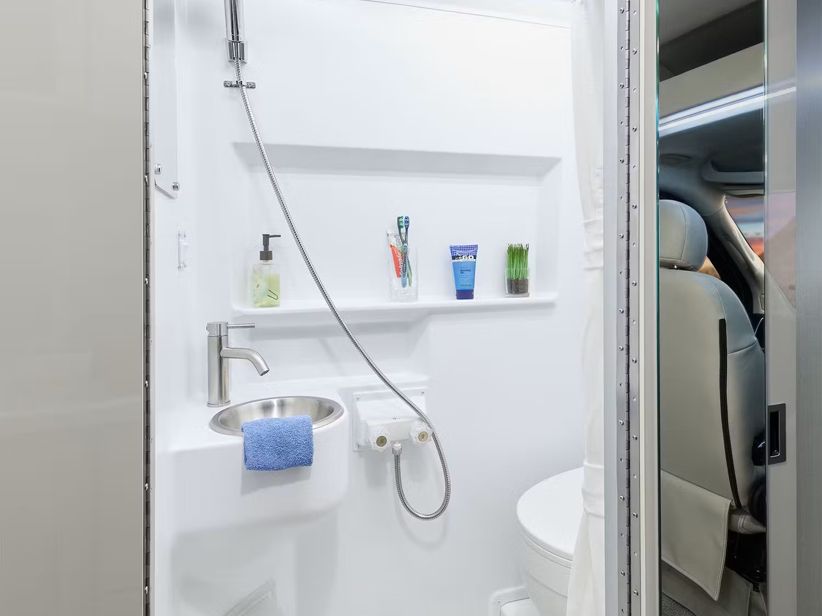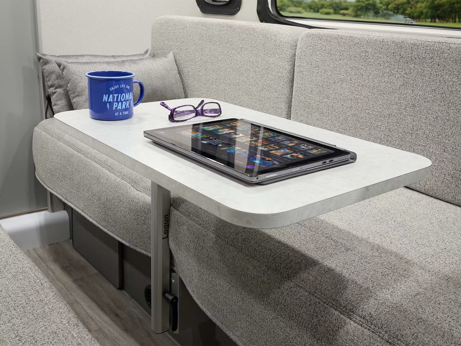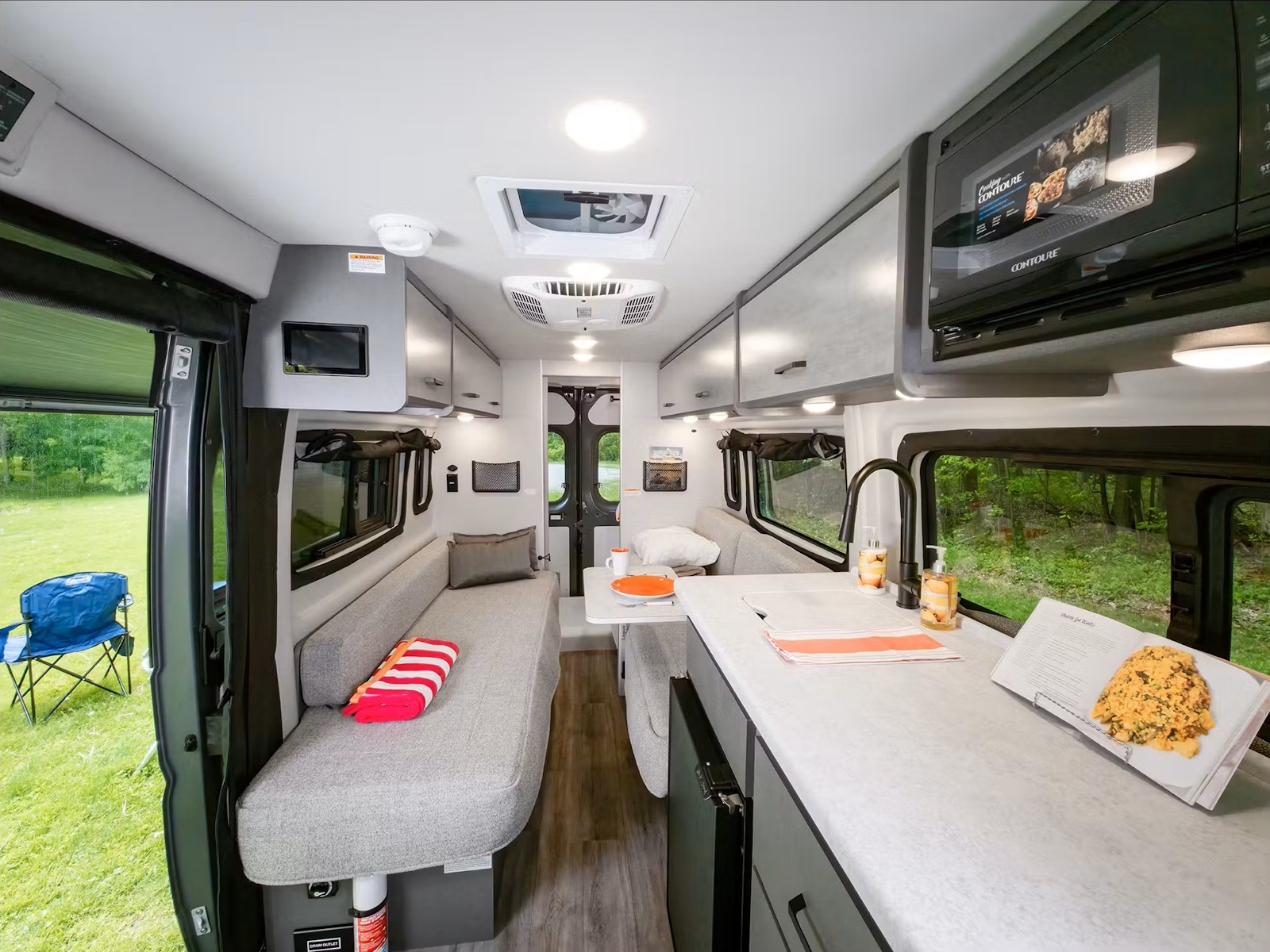 • The Tellaro® is designed for life on the road, featuring modern upper cabinets that keep your gear organized and out of sight. The bench-style seating effortlessly transforms into a cozy bed when it’s time to unwind. Swivel the captain’s chairs around to expand your lounge space, and pull down the privacy shades once the sun goes down. With the Rapid Camp+® system by Firefly Integrations, you can control lighting, climate, tank heaters, and the generator from the coach’s touchscreen or your smartphone, making van life easy.