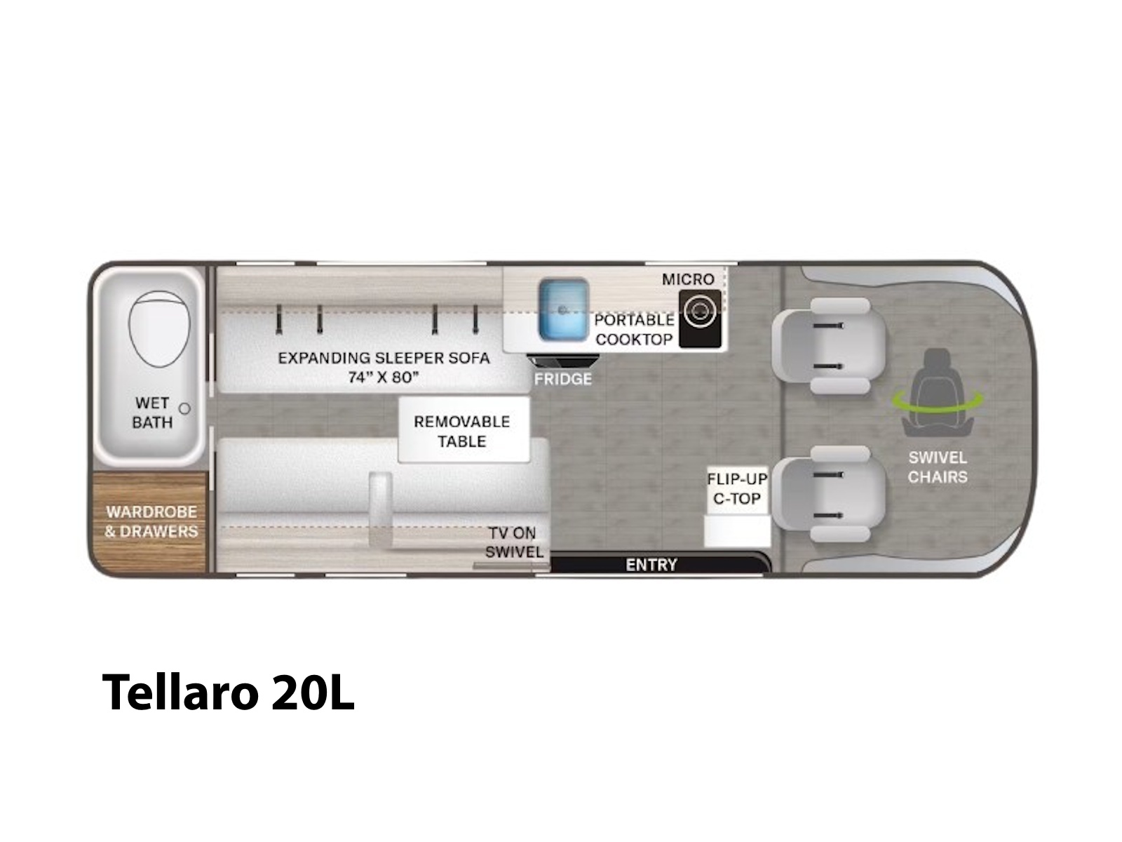 • Whip up tasty meals wherever you roam with the Tellaro®. A single-burner induction cooktop makes it easy to prep quick bites on the fly. Store fresh ingredients in the single-door 12-volt fridge in the 20L and 20LS floor plans or choose between the 20U, 20Y, 20US, and 20YS if a double-door refrigerator is more your speed. Reheat any leftovers in the microwave, then clean up fast with the stainless-steel single-bowl sink. If you need to plug in a coffee maker or blender, use the pop-up countertop outlet for instant power.