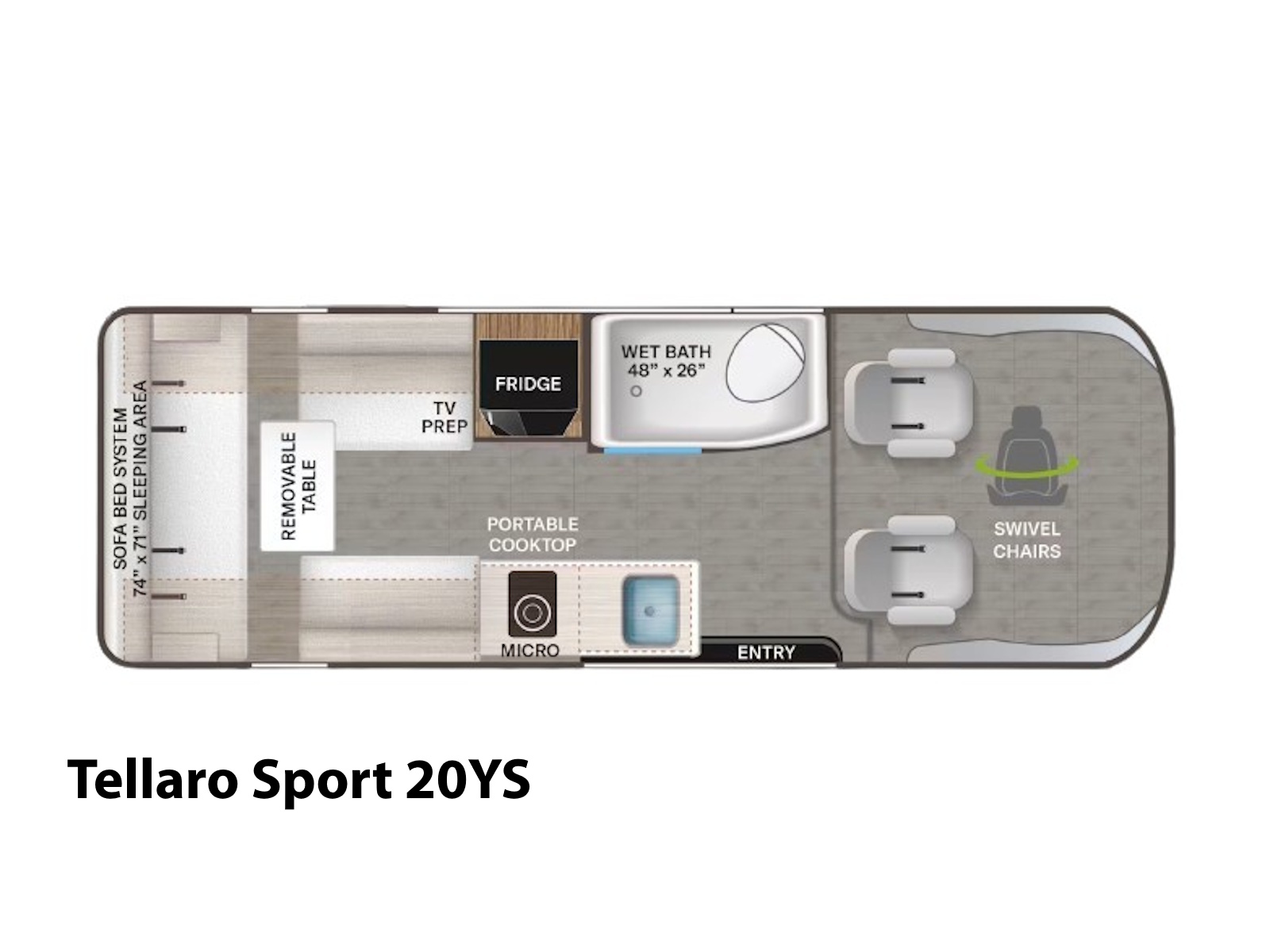 • Take your travels to the next level in the Tellaro®, where tech and convenience come standard. Navigate to any national park using the touchscreen dash radio with Apple CarPlay® and Android Auto™. At the same time, the steering wheel audio controls keep your focus on the road and your music just right. The 20L, 20U, and 20Y models are prepped for Starlink connectivity and feature a 24-inch Smart TV in the living area. These non-Sport layouts also include the Winegard® ConnecT™ 2.0 system, an all-in-one Wi-Fi extender, 4G hotspot, and TV antenna.
