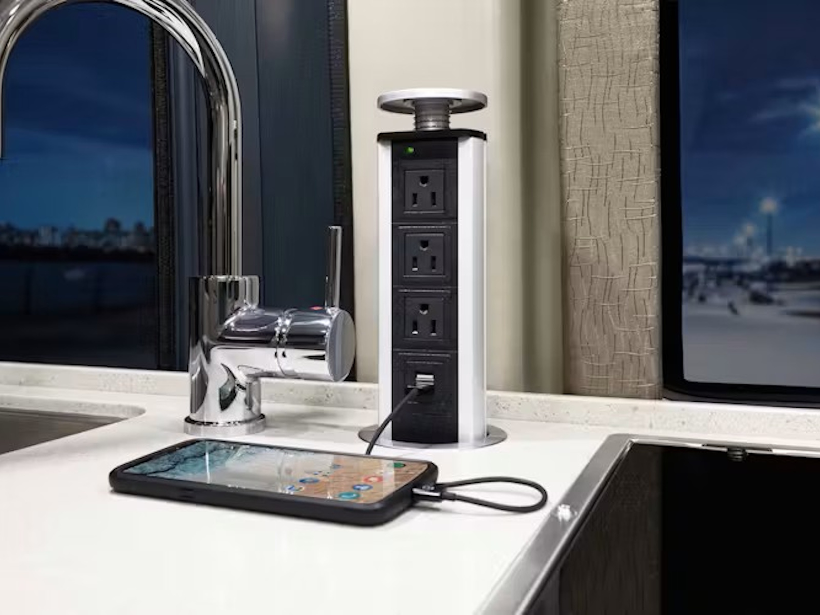 • Whip up tasty meals wherever you roam with the Tellaro®. A single-burner induction cooktop makes it easy to prep quick bites on the fly. Store fresh ingredients in the single-door 12-volt fridge in the 20L and 20LS floor plans or choose between the 20U, 20Y, 20US, and 20YS if a double-door refrigerator is more your speed. Reheat any leftovers in the microwave, then clean up fast with the stainless-steel single-bowl sink. If you need to plug in a coffee maker or blender, use the pop-up countertop outlet for instant power.