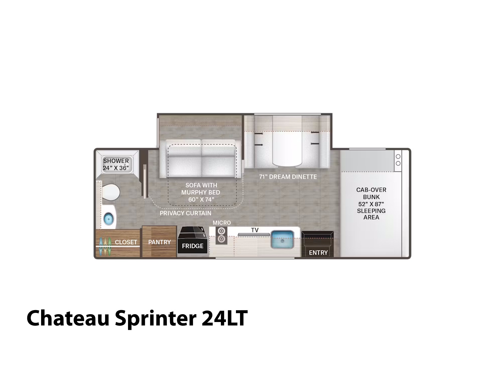 - Nothing is better than a restful night’s sleep after a day of exploring, and the Chateau® Sprinter delivers just that. Choose the 24LT floor plan with its space-saving Queen-size Murphy bed sofa for easy day-to-night living, or consider the 24LV model, which features convenient twin beds that transform into a roomy, luxurious King. No matter which layout you select, this Class C RV also includes a USB power charging center in the bedroom to keep your electronics ready for any adventure.