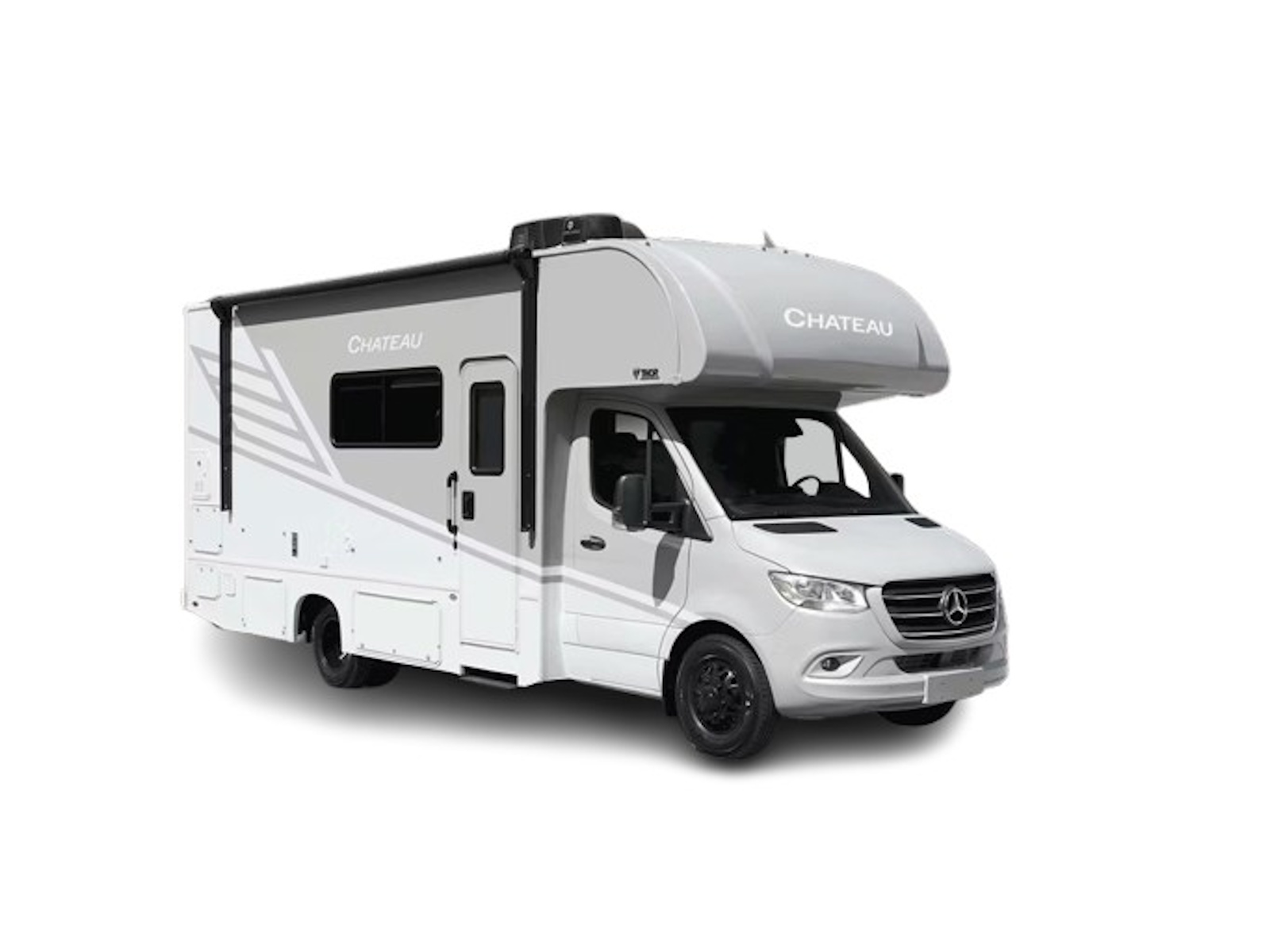 - Everything you need for the perfect outdoor escape is here. The Chateau® Sprinter features spacious, lighted rotocast storage compartments for your gear and a powered patio awning with integrated LED lighting for relaxing at your campsite. Fire up your grill using the external LP connection and enjoy meals out in the open. Go off-grid thanks to the 100-watt solar charging system with a power controller that keeps your batteries charged efficiently, and an exterior solar port lets you connect portable panels when rooftop access is limited.