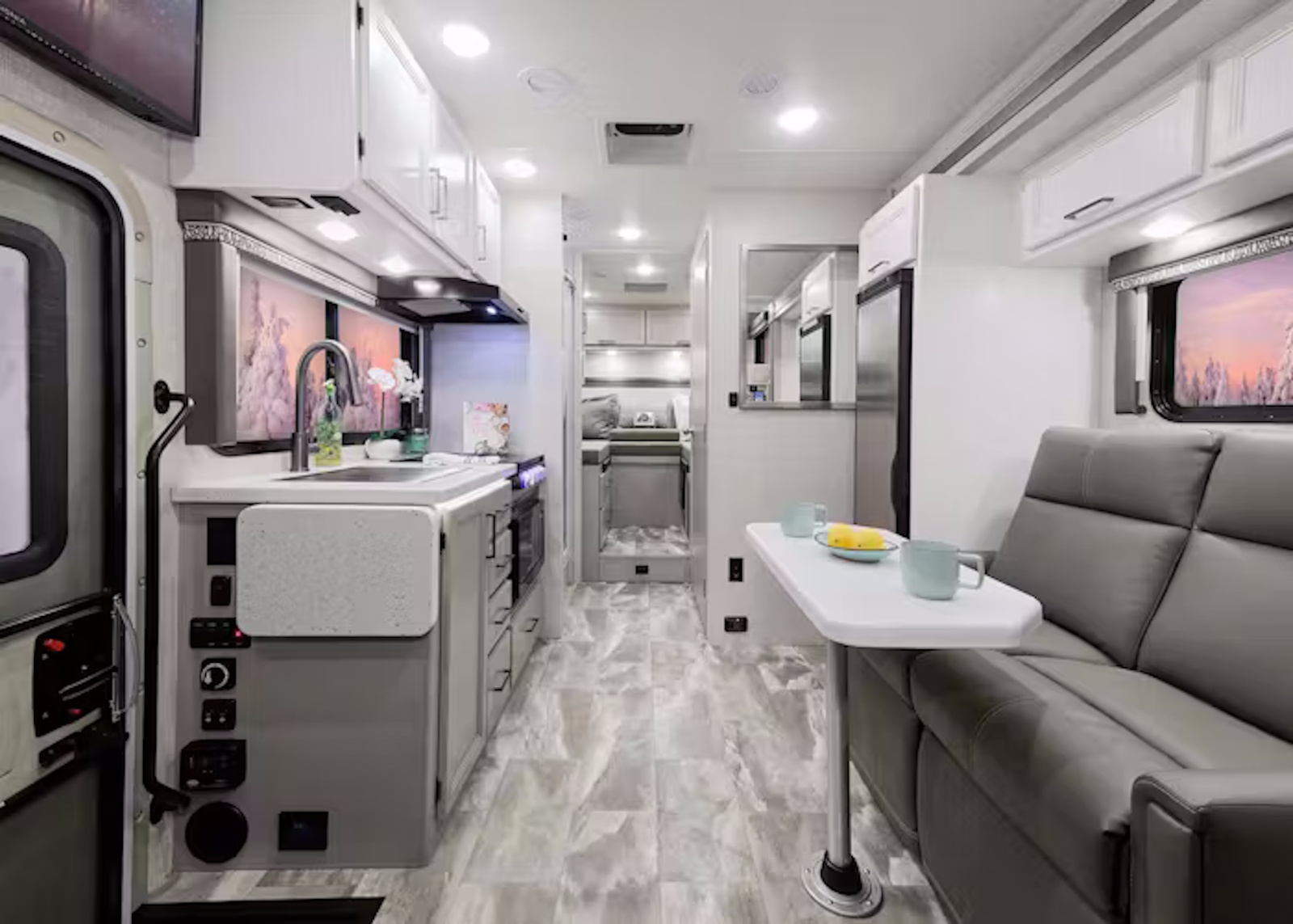 - Create your favorite meals on the road with the Echelon™ Sprinter’s fully equipped kitchen. You’ll find a 12-volt refrigerator, a convection microwave with built-in air fryer, a three-burner gas cooktop, and a sink with a stainless-steel cover for added counter space. If you need more room to prepare, the GL24 floor plan includes a handy flip-up countertop extension. When it’s time to clean up or relax, the tankless water heater delivers continuous hot water, perfect for rinsing dishes.