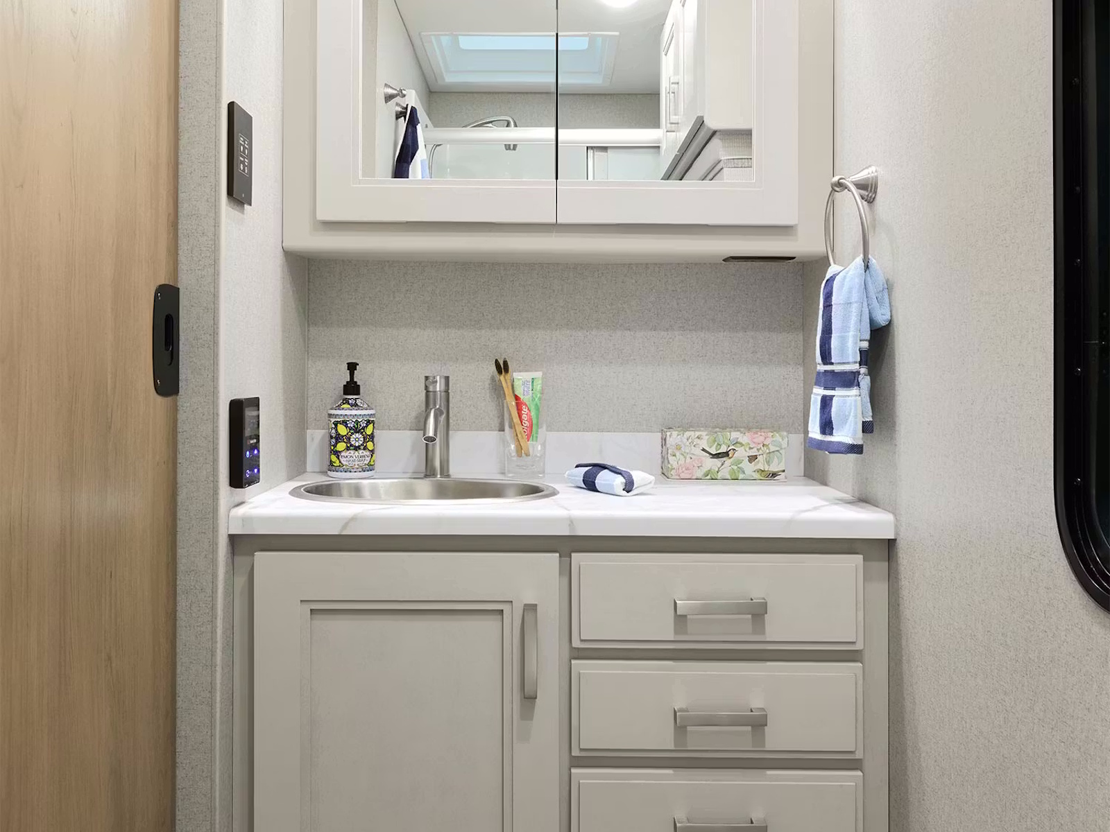 - Make RV living a breeze with the Winegard® ConnecT™ 5G system, which functions as an all-in-one Wi-Fi extender, 5G hotspot, and TV antenna. Stream your favorite shows on the Smart TV in the living area and bedroom, or take the fun outside with the 40-inch exterior LED TV, perfect for tailgating and outdoor movie nights. The 10-inch touchscreen dash radio in the cockpit puts in-cab entertainment and communication at your fingertips, featuring Bluetooth®, Apple CarPlay®, Android Auto™, and SiriusXM® prep.