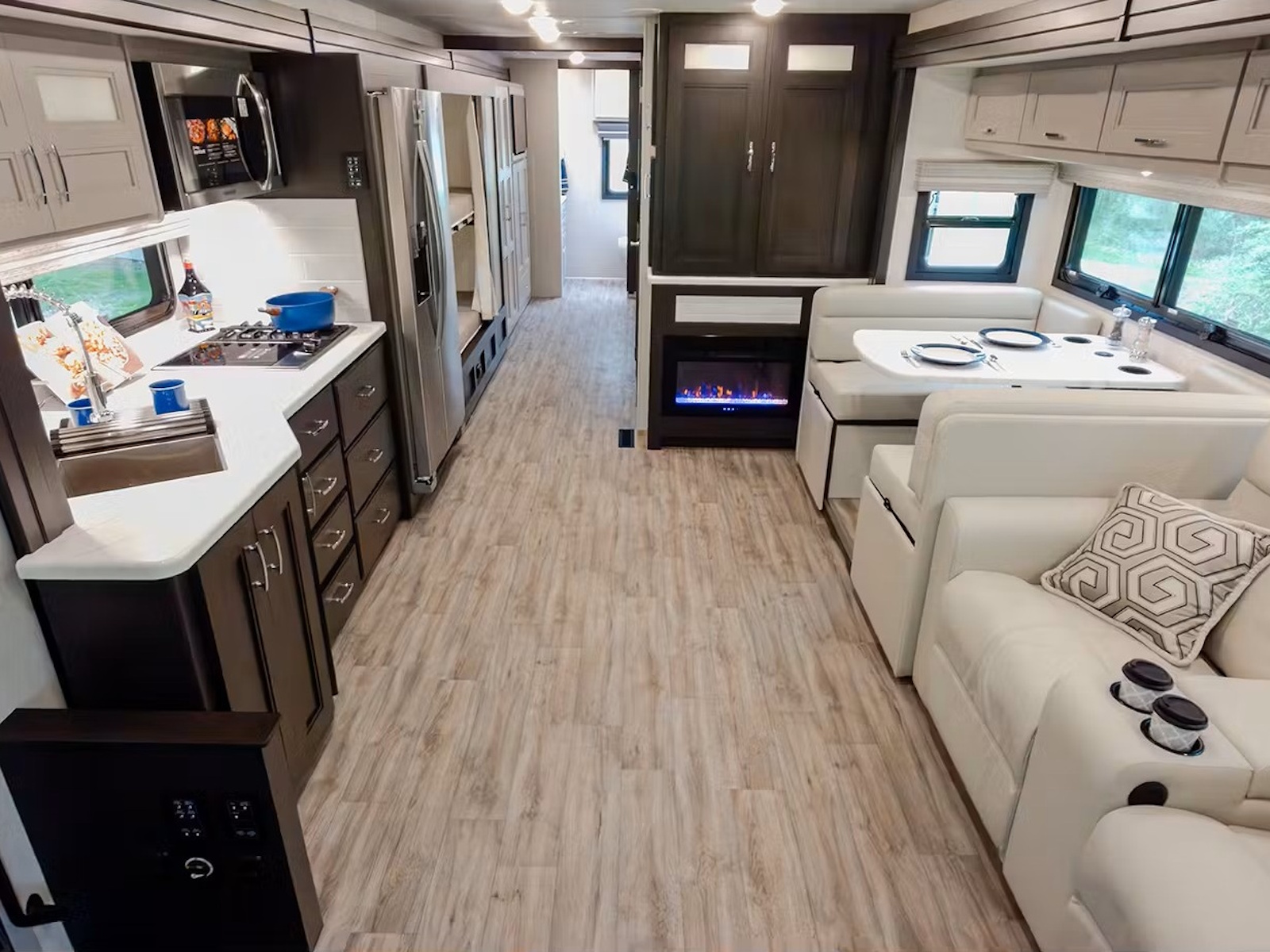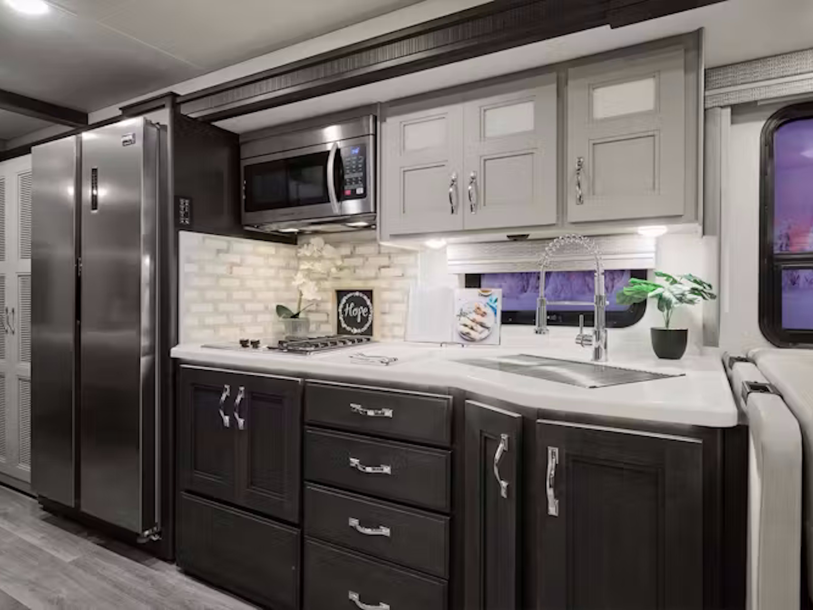 - Cook your favorite dishes on the road with ease in the Inception®. This well-appointed kitchen features a spacious pantry, a residential refrigerator with an in-door water and ice dispenser, and a double-bowl stainless steel sink with a pull-down sprayer for easy cleanup. Whether using the two-burner gas range top paired with a single induction cooktop or the convection microwave oven with an air fryer, you’ll have everything you need to whip up delicious meals that satisfy your cravings no matter where your travels take you.